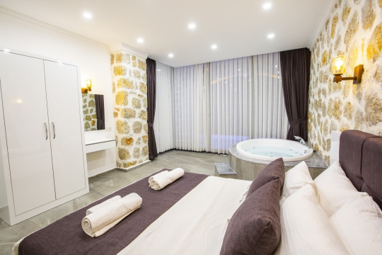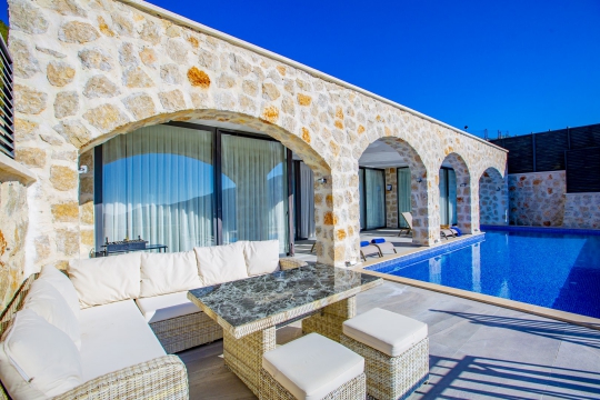 Villa Royal 5,Kalkan İslamlar köyünde balayı çiftleri ve çocuklu ailelere uygun, 3 yatak odalı, 6 kişiye kadar konaklama kapasitesine sahip villamızda sevdiklerinizle güzel vakit geçirebilmeniz için geniş bir havuz terası yer almaktadır. Havuzu korunaklı ve bahçesi dışarıdan görünmeyen Villa Royal 5 iş stresinden ve kirli havadan uzaklaşabileceğiniz unutulmaz bir tatil sizleri beklemektedir. Balayı villaları ve jakuzili villalar seçeneklerimizde yer alan villamızın ebeveyn yatak odasında jakuzi bulunmaktadır.
