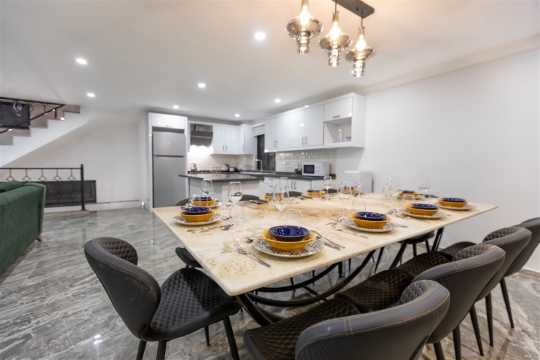 Mutfak: Tam donanımlı modern Amerikan mutfağında, buzdolabı, bulaşık makinesi, çamaşır makinesi, mikrodalga fırın, elektrikli, su ısıtıcısı, 4’lü ocak, 10 kişilik yemek ve bardak takımı bulunmaktadır.