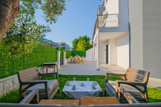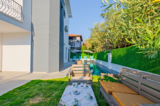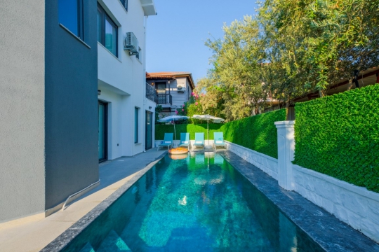 Bahçe : Özel yüzme havuzu, şezlong, yemek masası, özel barbekü alanı bulunmaktadır.