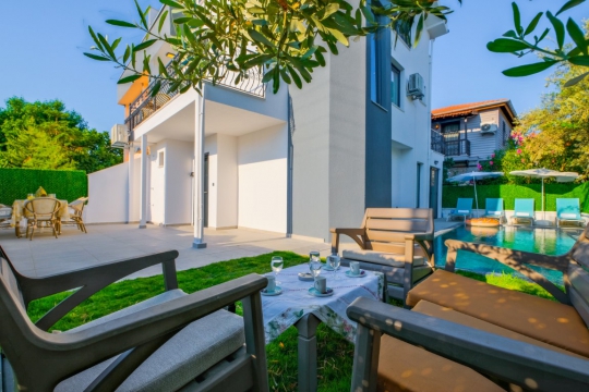 Fethiye kordon, sahil yürüyüş bandına yakın mesafede olan villamız, özel havuzuyla tatilinize eşlik eder. Kalabalık aile ve arkadaşlar için ideal villamızdan markete, fırına, merkeze ve otobüs durağına yürüme mesafesindedir ve kolayca ulaşabilirsiniz. Eğlenceli yaz akşamları geçirmenizi sağlayan bahçesi ve ferah odaları ile tatilinizi unutulmaz kılmak için buradayız. 3 katlı olan villamızın giriş katında mutfak, salon ve banyo,Tuvalet bulunmaktadır. 2.katında ise 2 adet Twin, bir adet Double oda bulunmaktadır. 3. katında Kingsize yatak, Jacuzzi, 1 adet banyo ve tuvaleti bulunuyor.