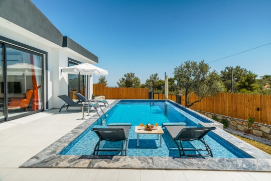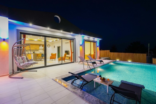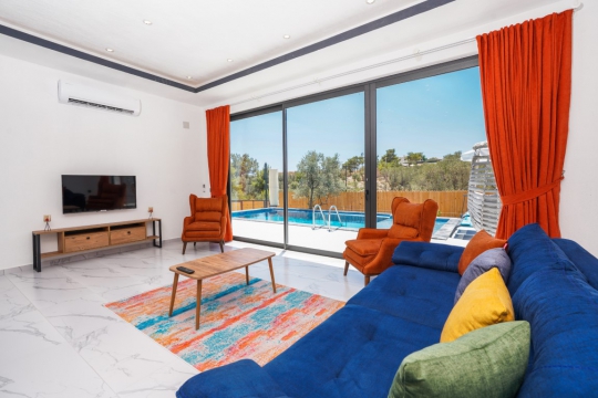 Detayları; Oturma grubu, Uydu TV (LCD), Klima, yemek masası, Havuz terasına çıkış,