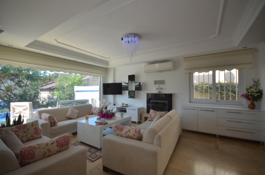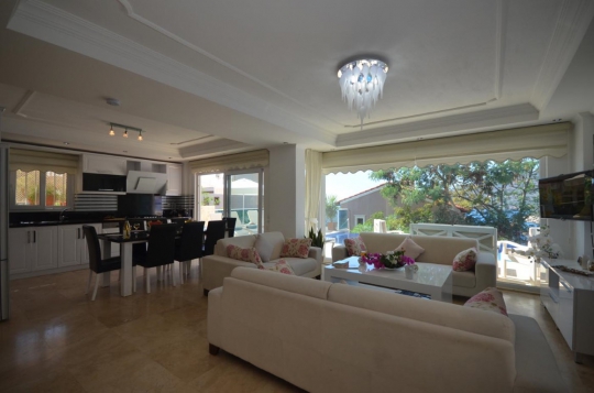 Salon : Açık plan şık bir salonu bulunmaktadır. Salonda konforlu oturma odası takımı, kanepe ve koltuklar, şömine, DVD, CD çalar, uydu TV, yemek masası ve sandalyeler yer almaktadır. Havuza çıkış bulunmaktadır ve buradan havuz terası ve bahçeye çıkılmaktadır.