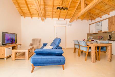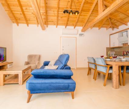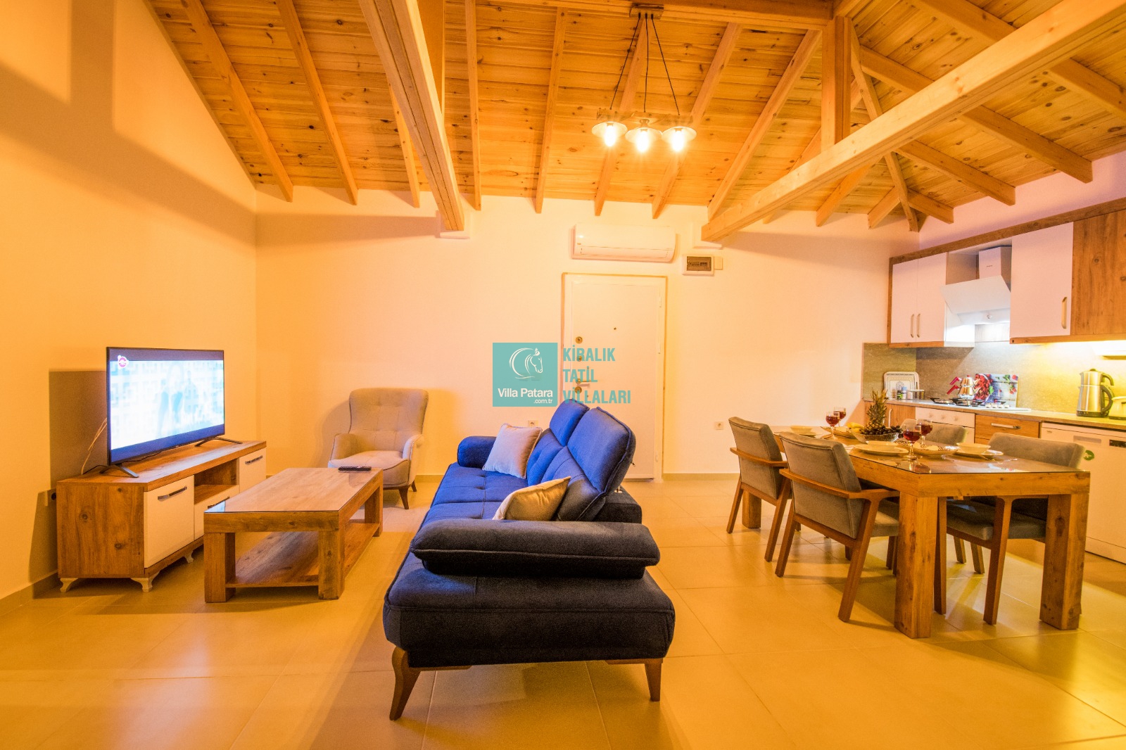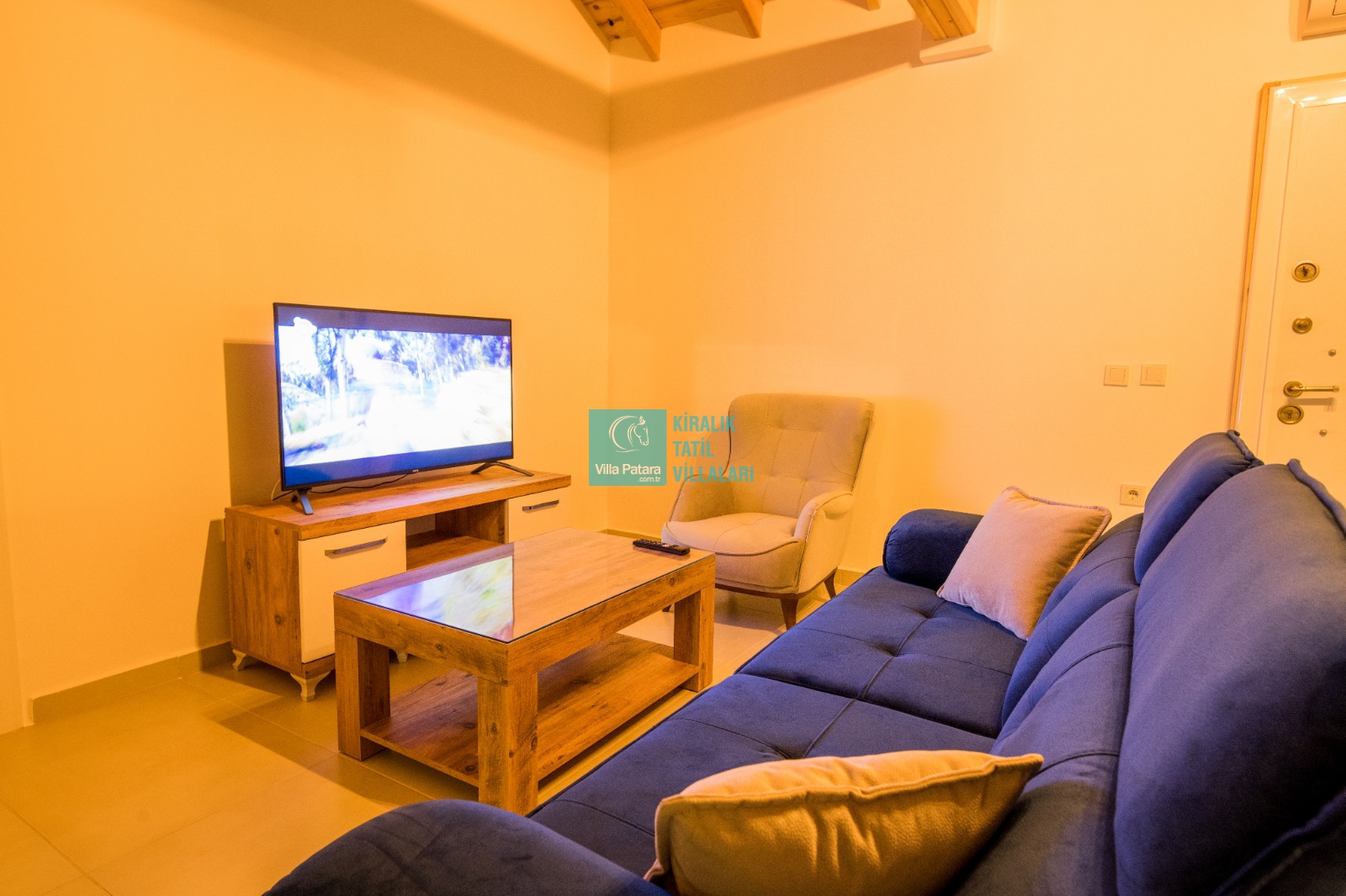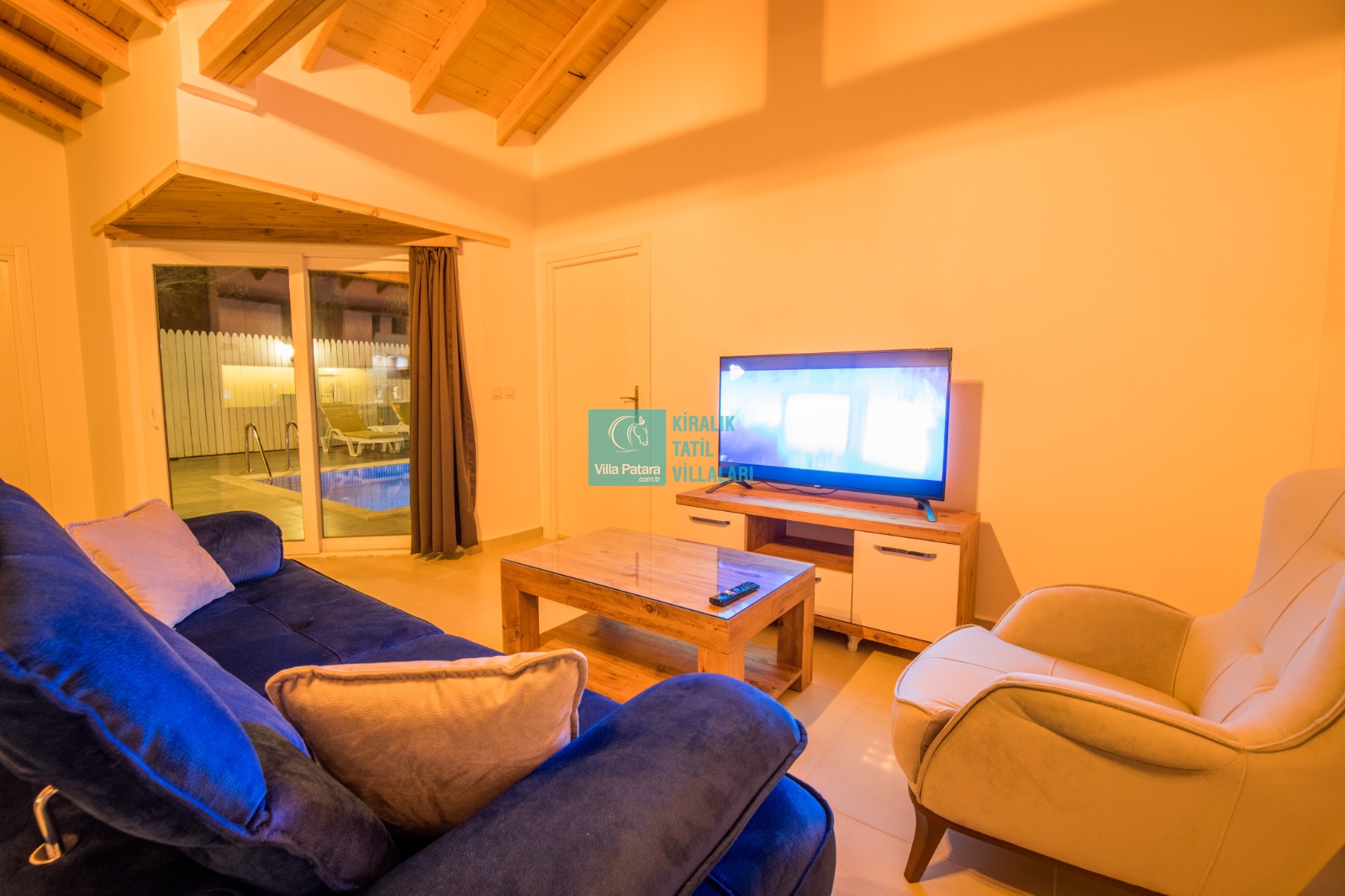 Salon içerisinde oturma grubu, ses sistemi, TV, klima, sehpa bulunmaktadır. Havuz terasına çıkış yapılabilmektedir.