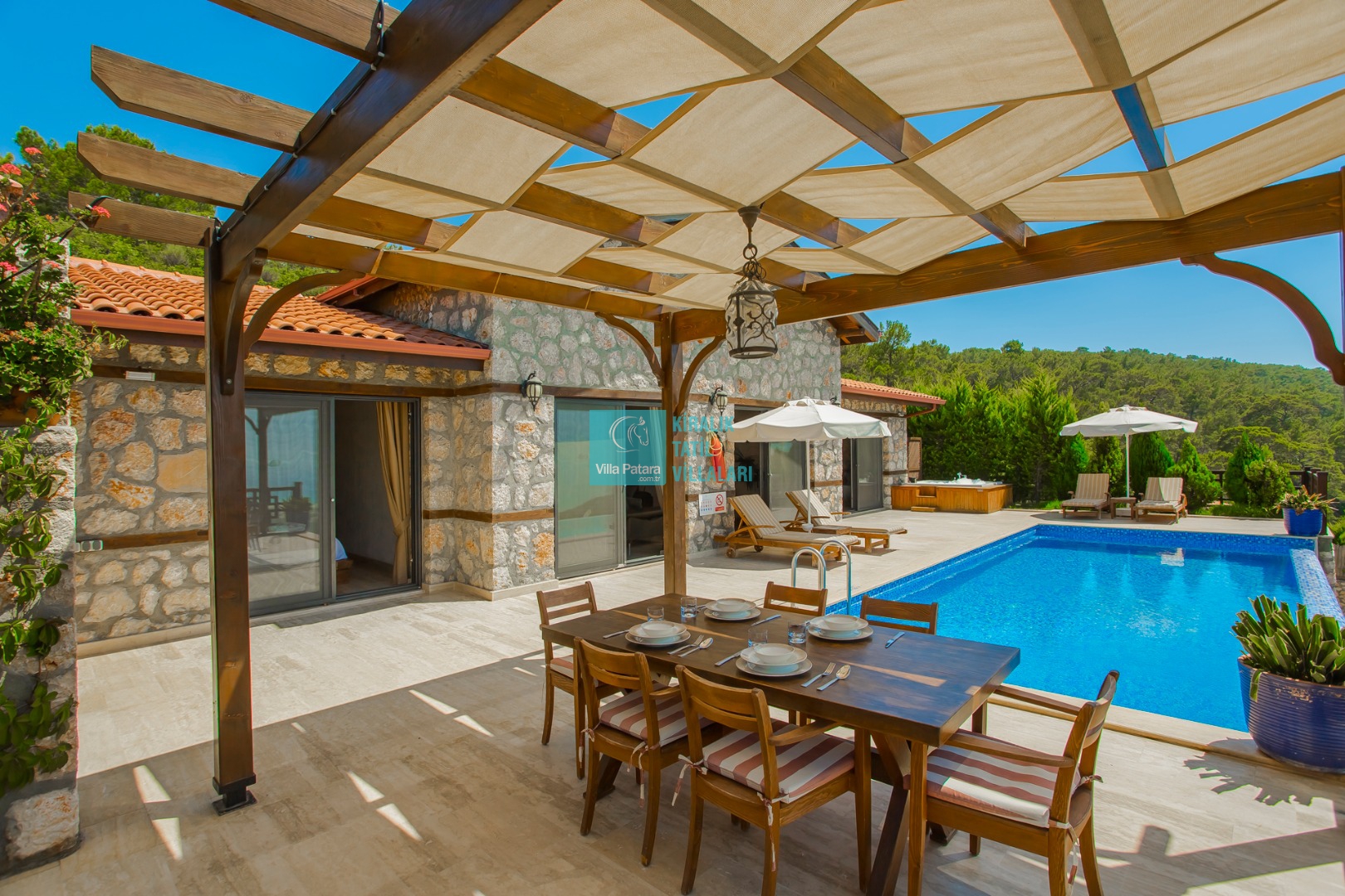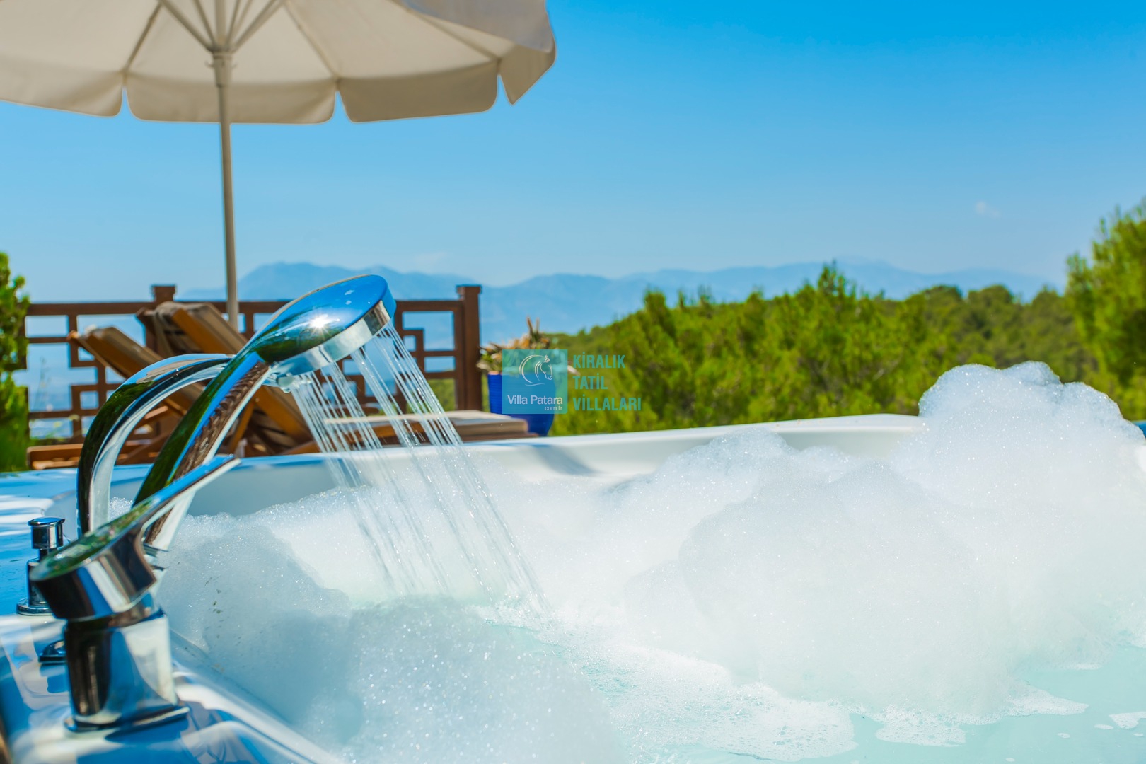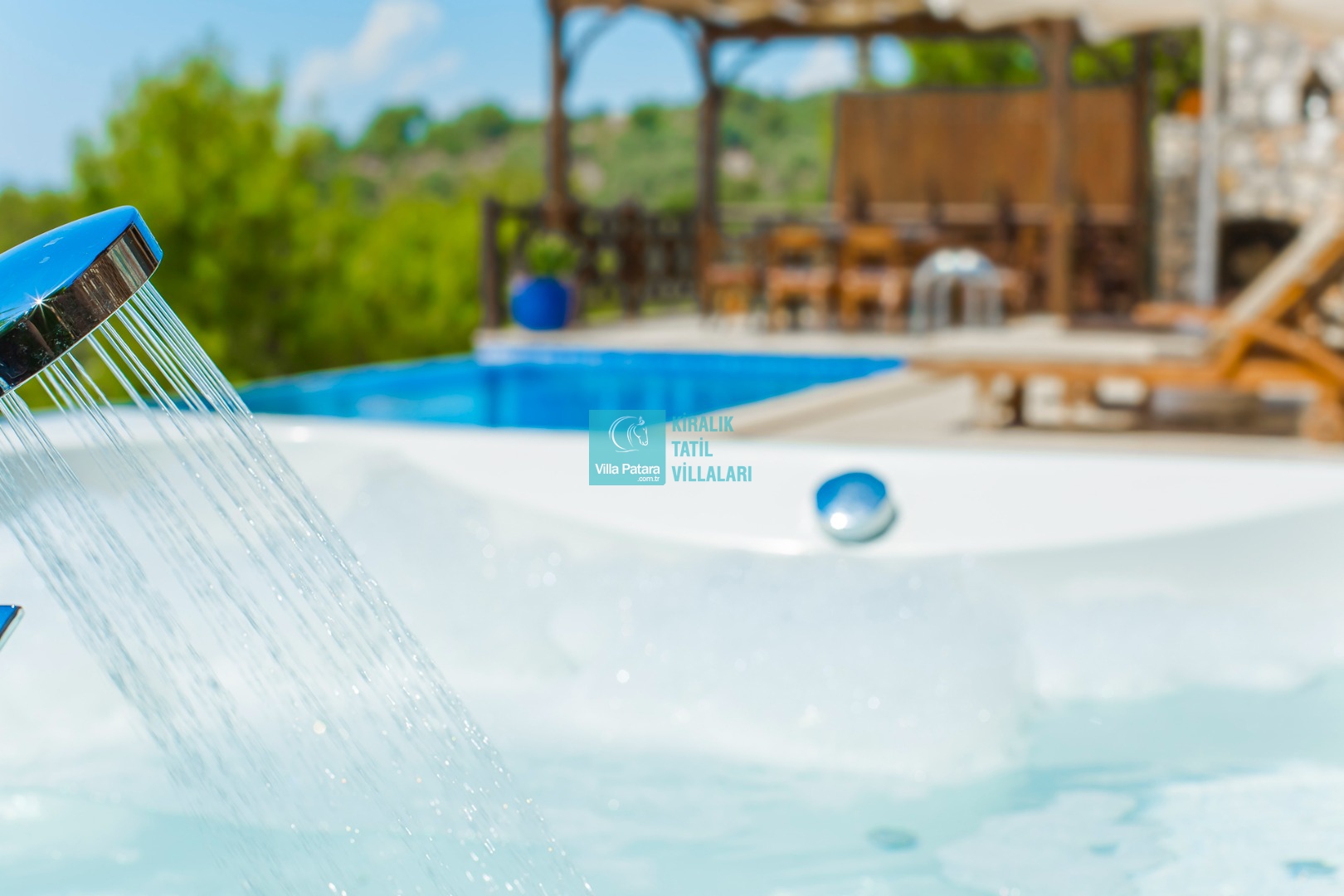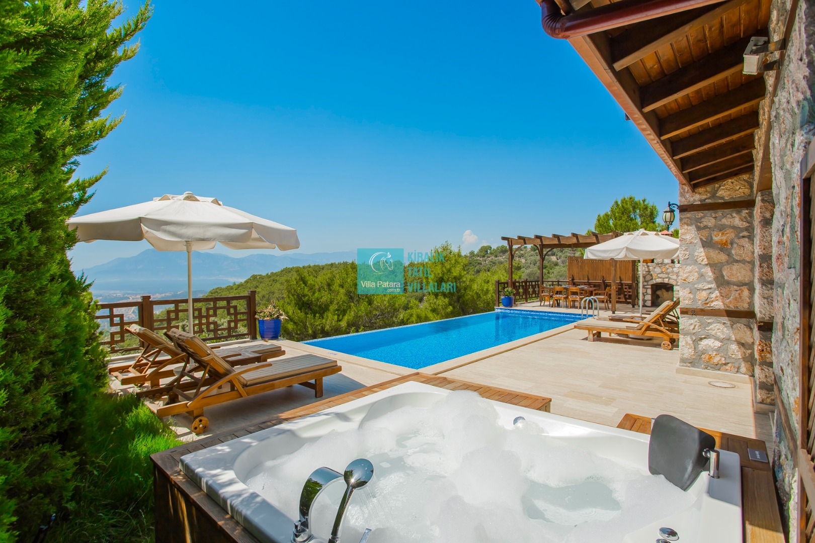 HAVUZ TERASI: Geniş havuz terası ve özel yüzme havuzunun bulunduğu bahçede; muhteşem Patara manzarasına karşı jakuzi, şezlonglar, güneş şemsiyesi,6 kişilik yemek masası, mangal yeri bulunmaktadır.