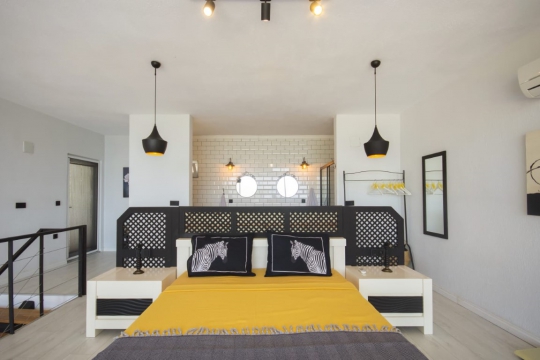 Özel dizayn Villamız asma katlı olup, ayrıca bir sinema salonu da mevcuttur. Asma katında bulunan ana yatak odamızda önündeki galeri sayesinde muhteşem bir manzara ile uyanacak ve bu manzara ile güne başlayacaksınız. Villamızın kalp şeklindeki ana havuzu ve oldukça keyifli bir havuz terası bulunmaktadır. İki adet gölgelikli oturma ve yemek alanı mevcuttur. Bu alanlarda günün yorgunluğunu atabilirsiniz. Havuz içinde bulunan hidromasaj jakuzi sistemi ile suyun masaj etkisi kaslarınızı gevşetecek. Alt katta bulunan genç odamızda ve ana yatak odasında Lavabo wc, ve duş bulunmaktadır. Sinema odamızda özel koltuklarınızda adete gerçek sinema keyfini yaşayacaksınız.