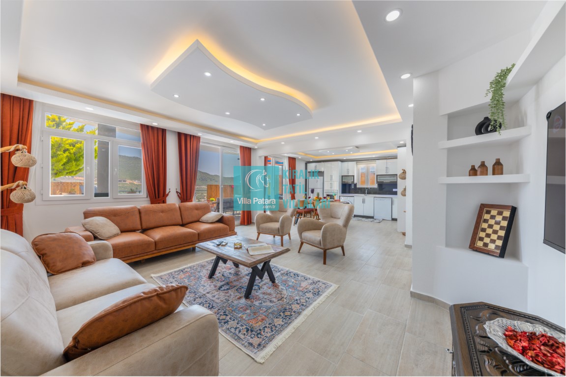 Salon: Oturma grubu, orta sehpa, TV, klima, havuz terasına çıkış bulunmaktadır.