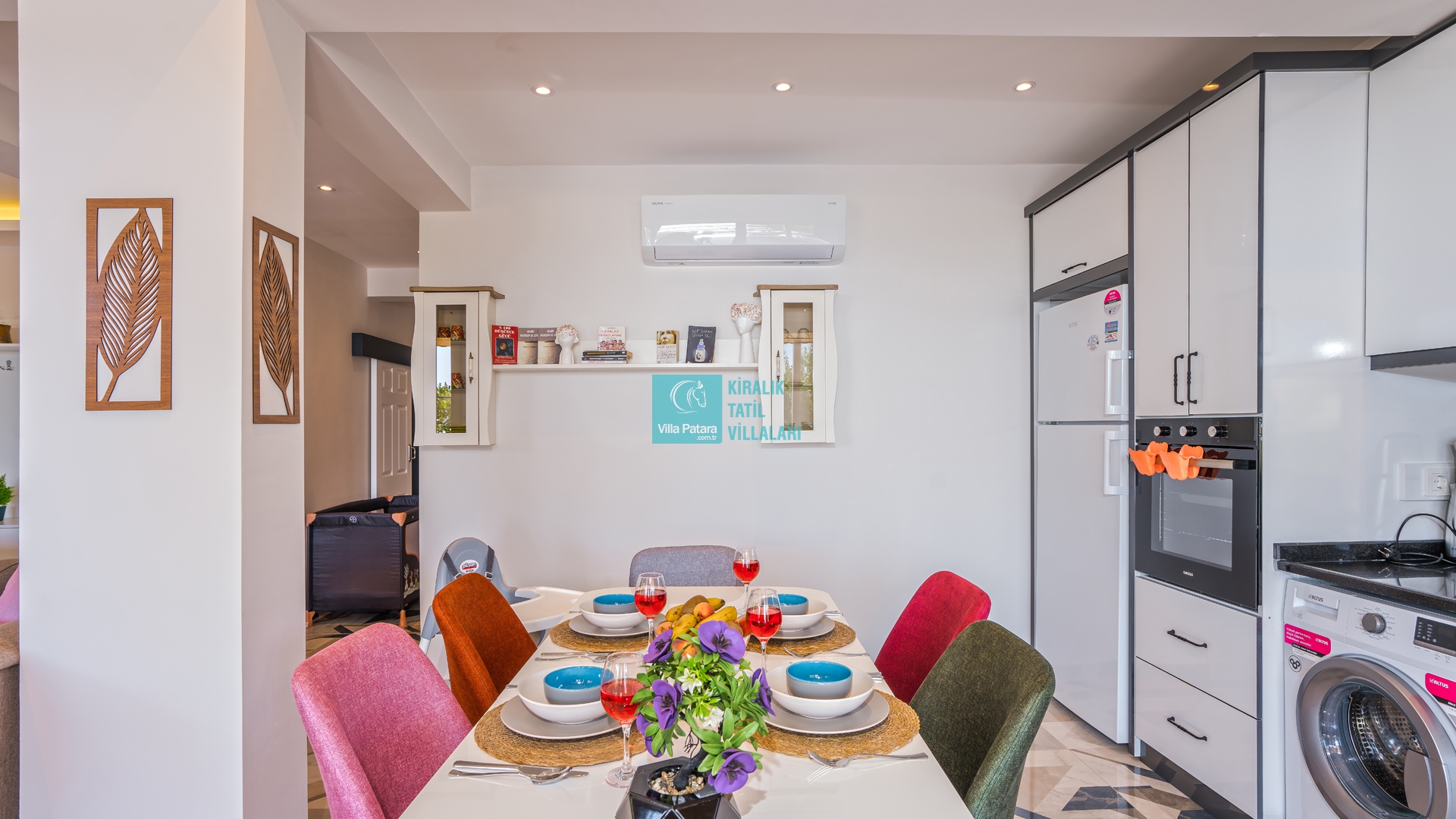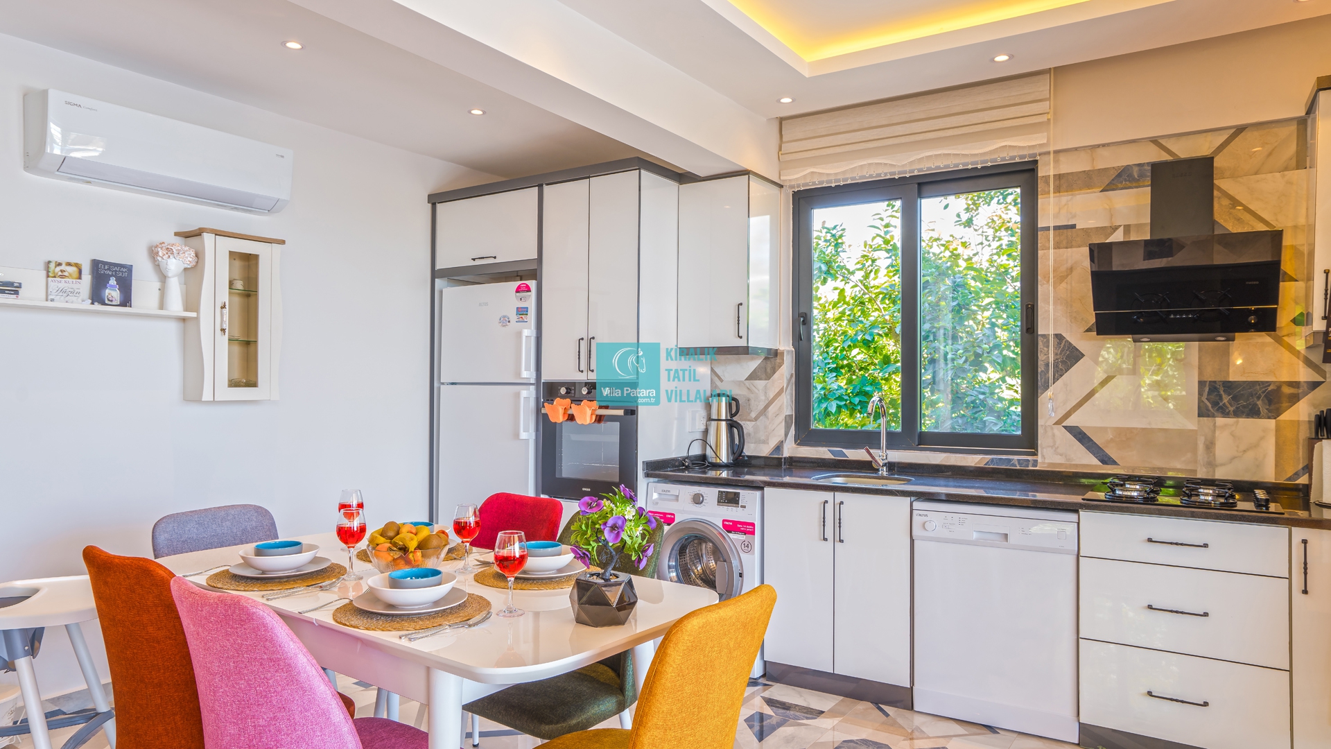 Villamız günlük hayatta sık kullanılan; Mikrodalga fırın, ankastre fırın, buzdolabı, çamaşır makinası, bulaşık makinesi, elektrikli su ısıtıcı kettle, ankastre 4’lü ocak, 4 kişilik yemek takımı, kaşık ve çatal takımı, tencere ve tava takımı, bardaklar yer almaktadır. İhtiyacınız durumunda villamızda bulunmayan malzemeler hakkında bizle iletişime geçebilir ve yardım isteyebilirsiniz.