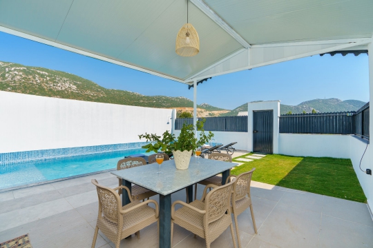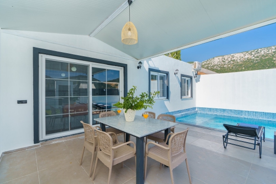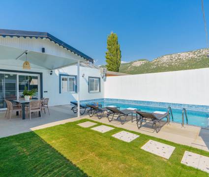 Salon: Villanın eşsiz doğa manzarasını seyredebileceğiniz bu salonda lüks bir oturma odası, TV, klima, sehpa, yemek masası, lavabo ve tuvalet yer almaktadır. Ayrıca salondan havuz terasına çıkış mevcuttur.