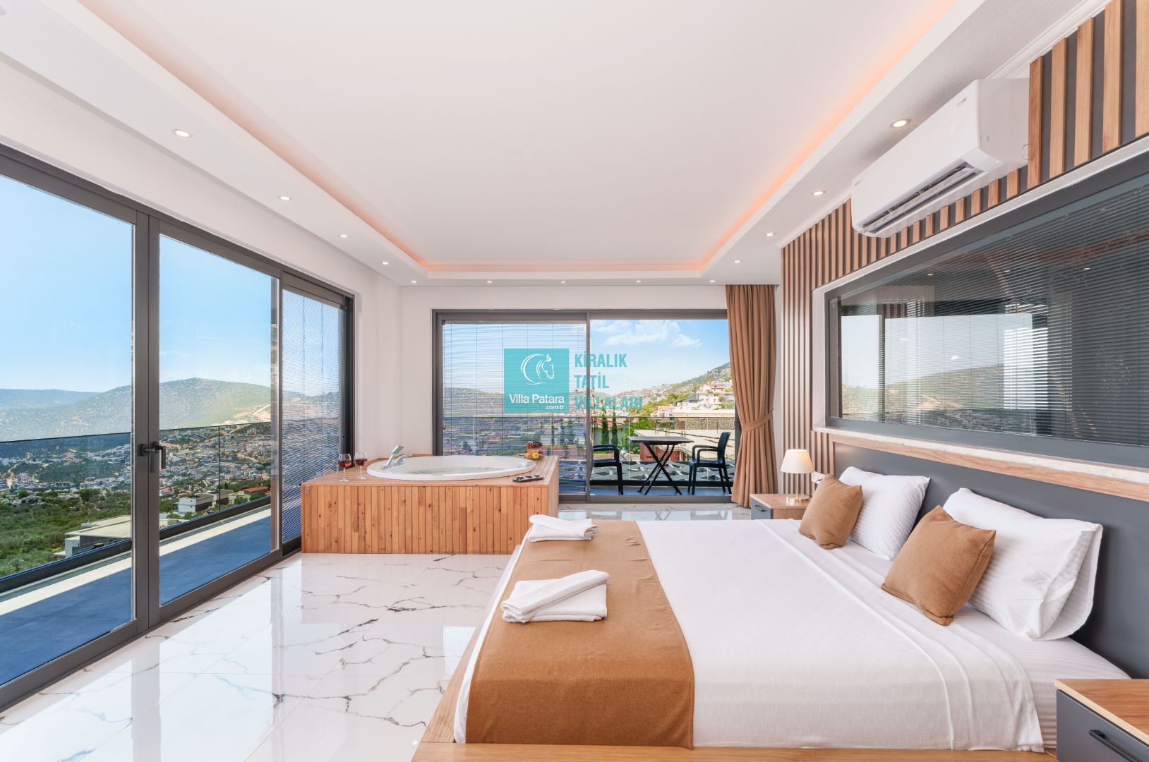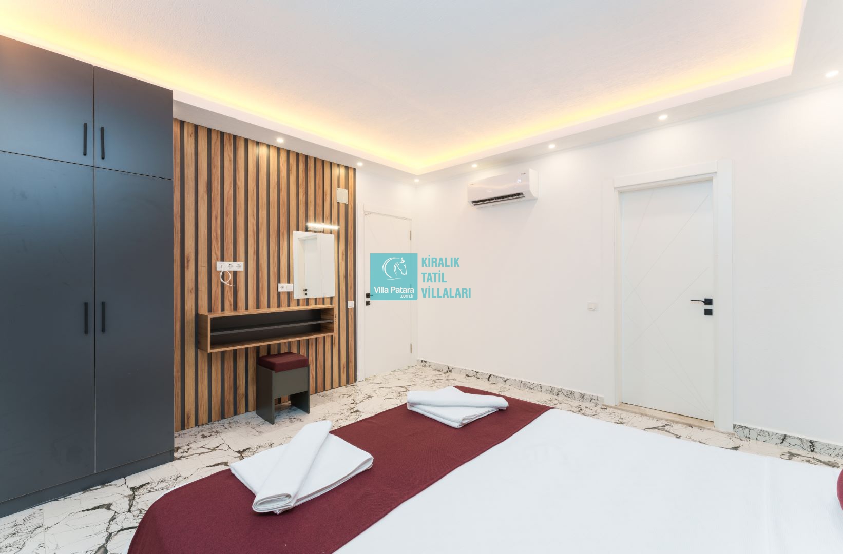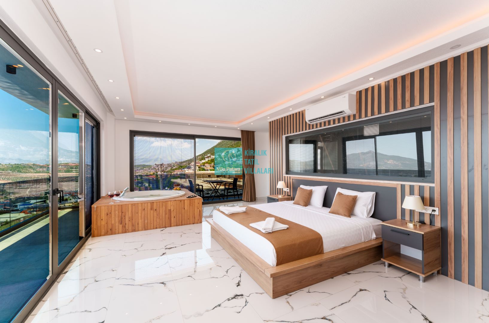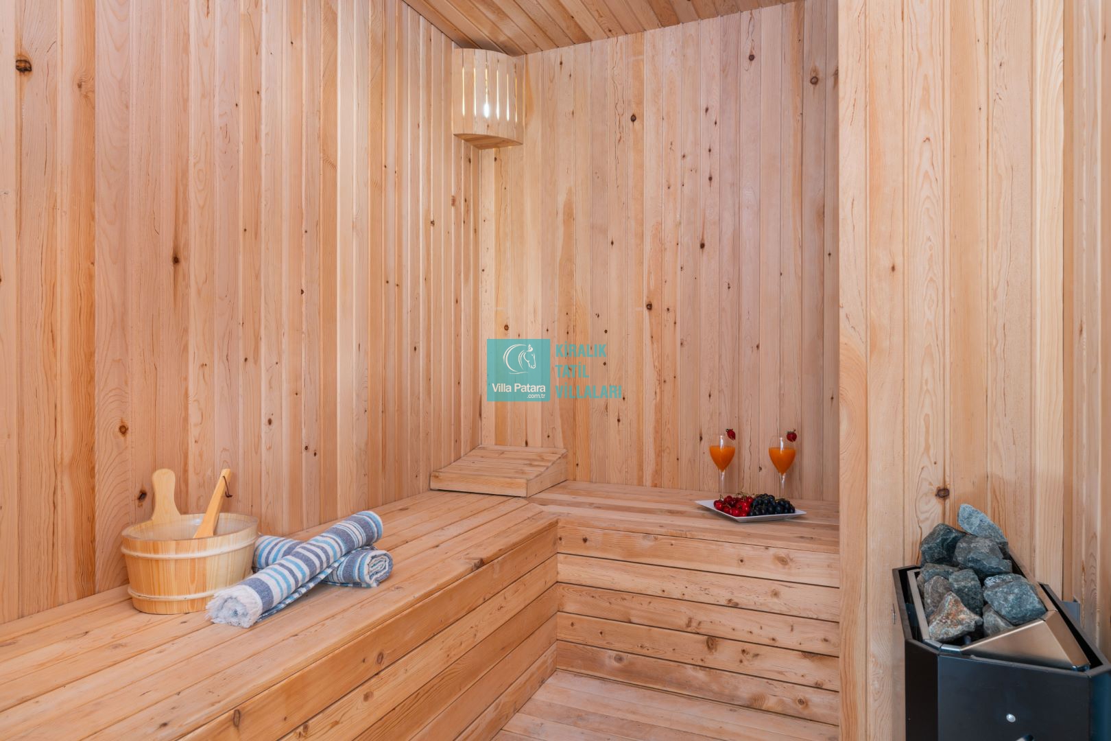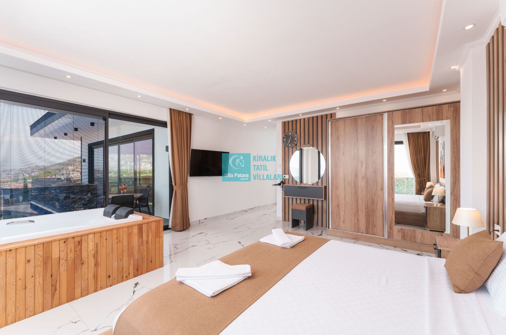 Villamızın içerisinde beş yatak odası ve yedi banyosu bulunmaktadır. Birinci yatak odası içerisinde bir adet çift yatak, banyo; İkinci yatak odası içerisinde bir adet çift kişilik yatak, banyo, jakuzi, klima ve tv; Üçüncü yatak odası içerisinde bir adet çift kişilik yatak, banyo, jakuzi, klima ve tv; Dördüncü yatak odası içerisinde bir adet çift kişilik yatak, banyo ve klima; Beşinci yatak odası içerisinde iki adet tek kişilik yatak, banyo, ve klima bulunmaktadır. Villamızın içerisinde iki adet salon bulunmaktadır. Salon içerisinde mutfak, klima, iki adet banyo, sauna, hamam mevcuttur.