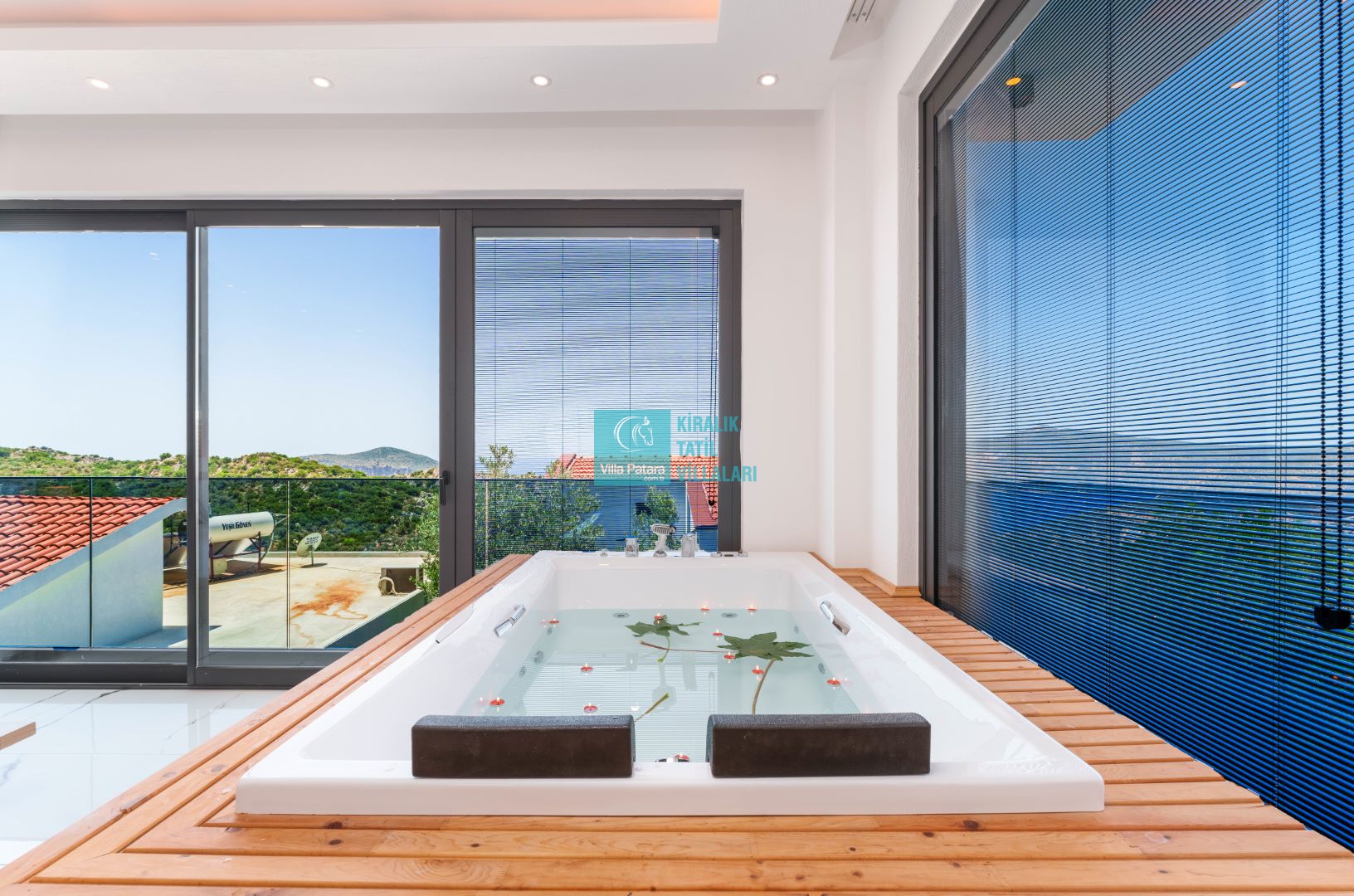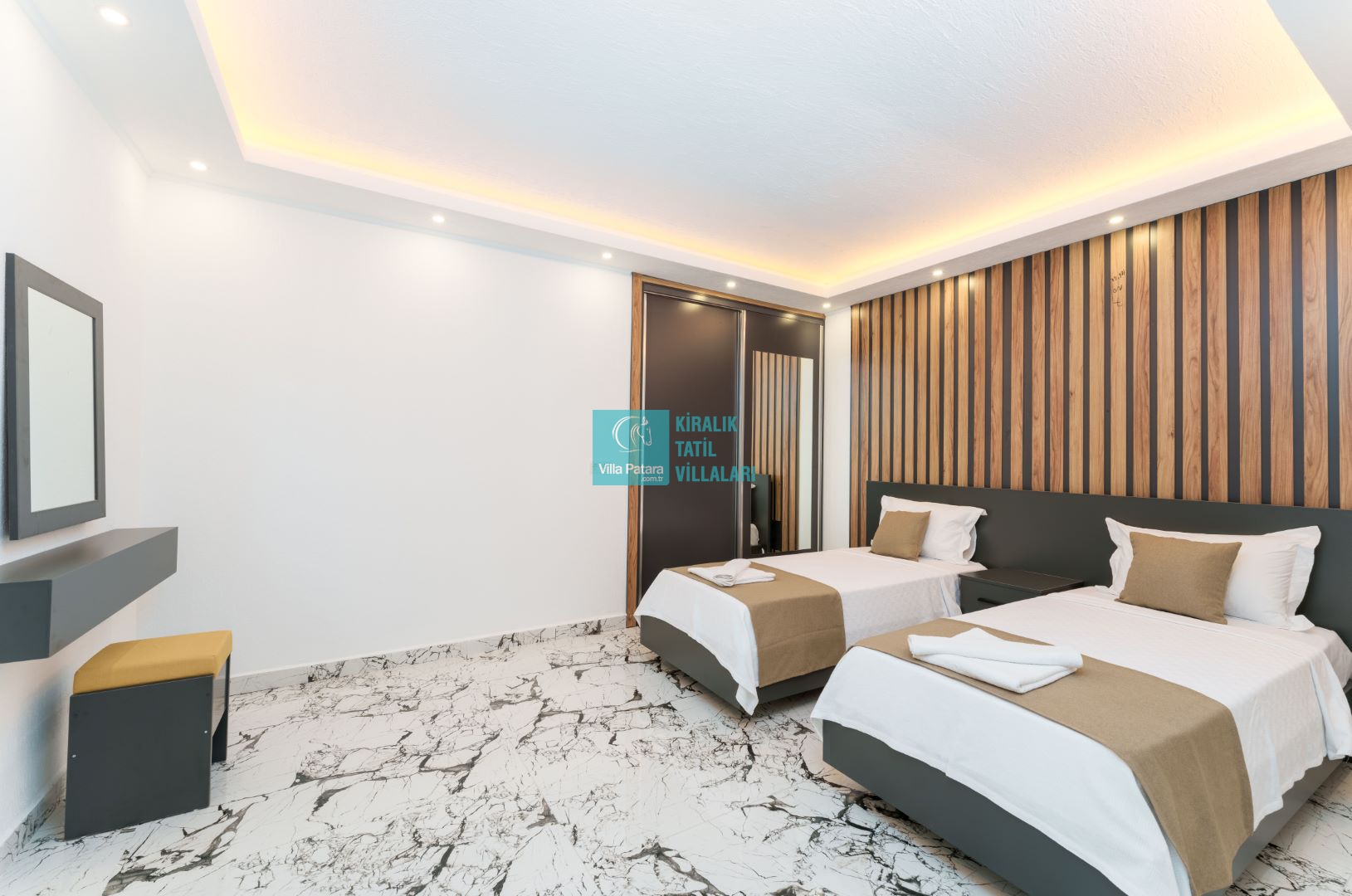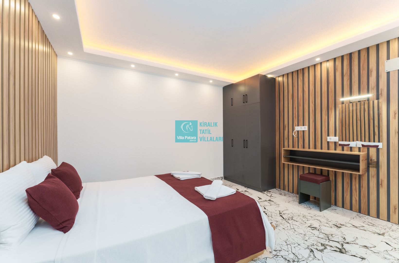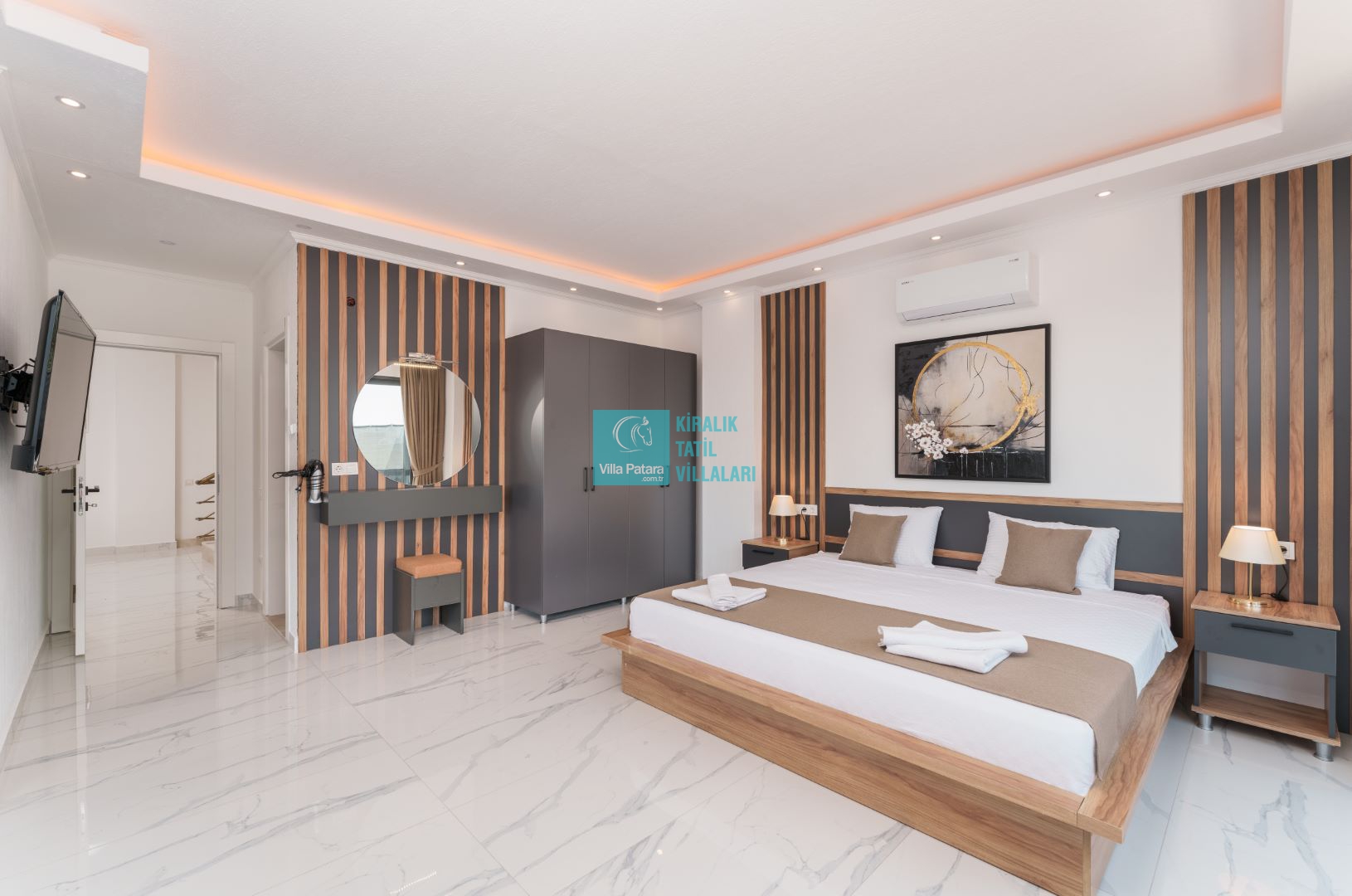 Villamızın içerisinde beş yatak odası ve yedi banyosu bulunmaktadır. Birinci yatak odası içerisinde bir adet çift yatak, banyo; İkinci yatak odası içerisinde bir adet çift kişilik yatak, banyo, jakuzi, klima ve tv; Üçüncü yatak odası içerisinde bir adet çift kişilik yatak, banyo, jakuzi, klima ve tv; Dördüncü yatak odası içerisinde bir adet çift kişilik yatak, banyo ve klima; Beşinci yatak odası içerisinde iki adet tek kişilik yatak, banyo, ve klima bulunmaktadır. Villamızın içerisinde iki adet salon bulunmaktadır. Salon içerisinde mutfak, klima, iki adet banyo, sauna, hamam mevcuttur.