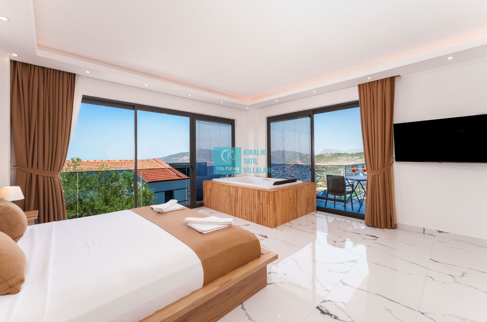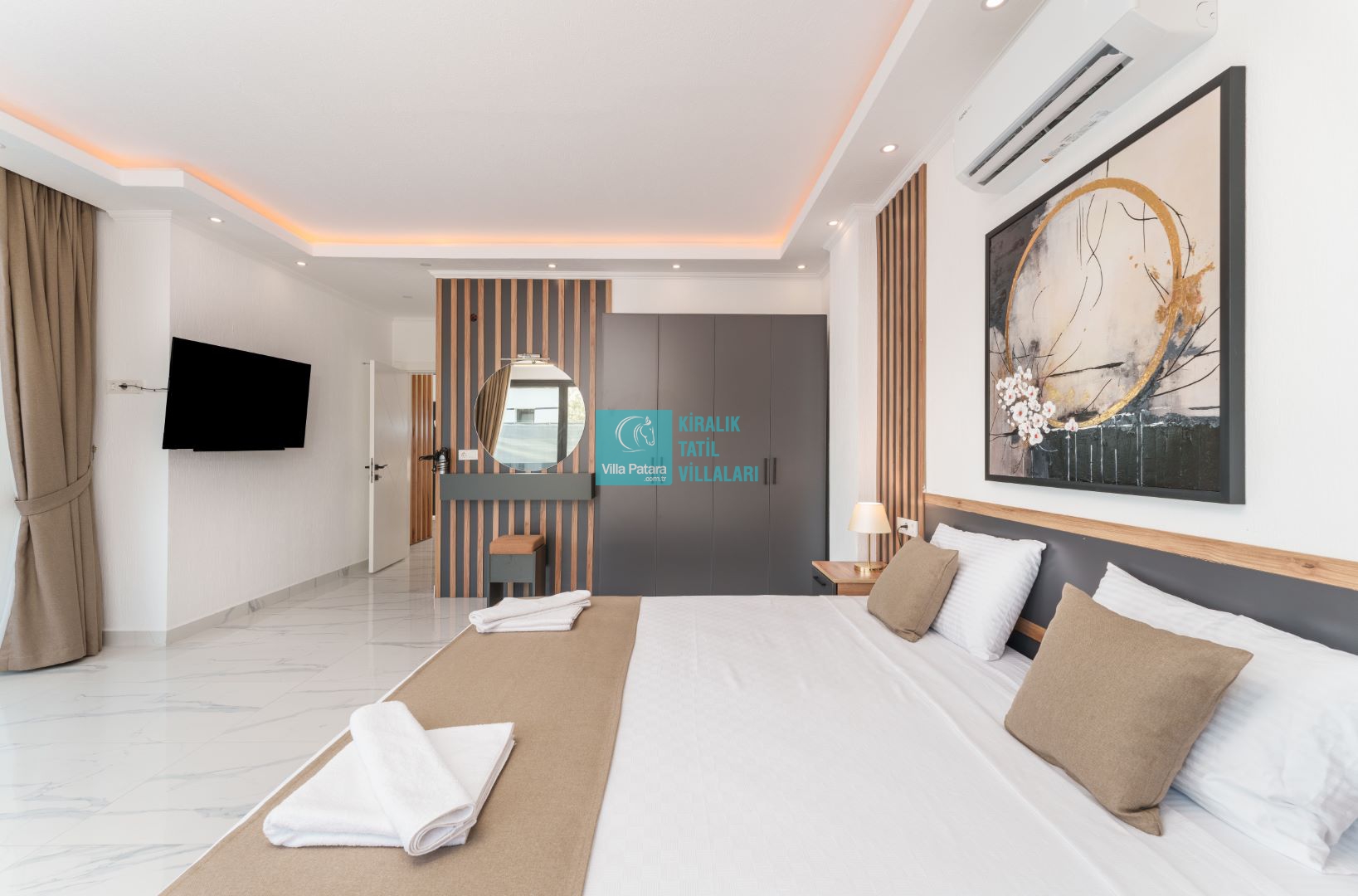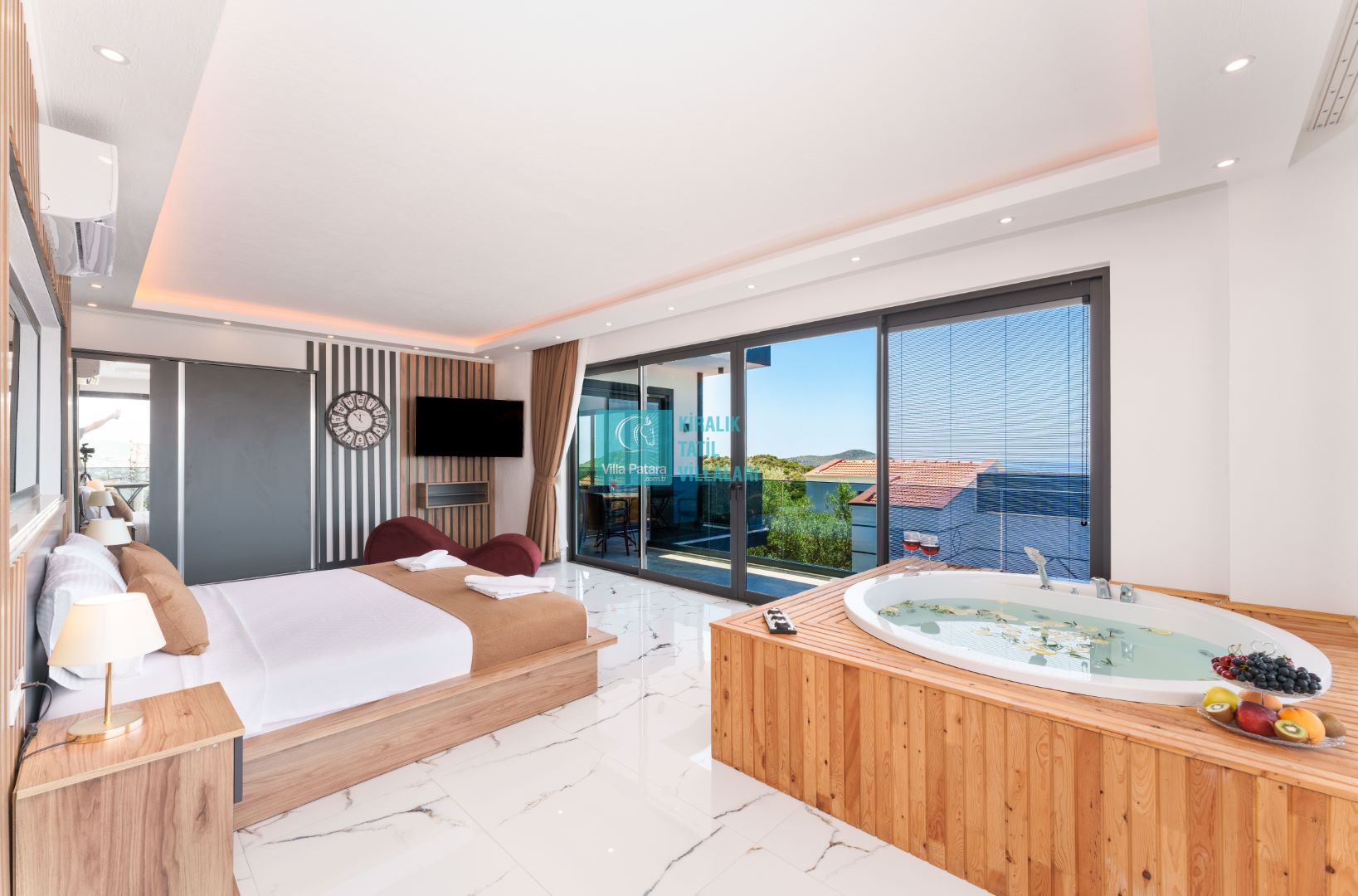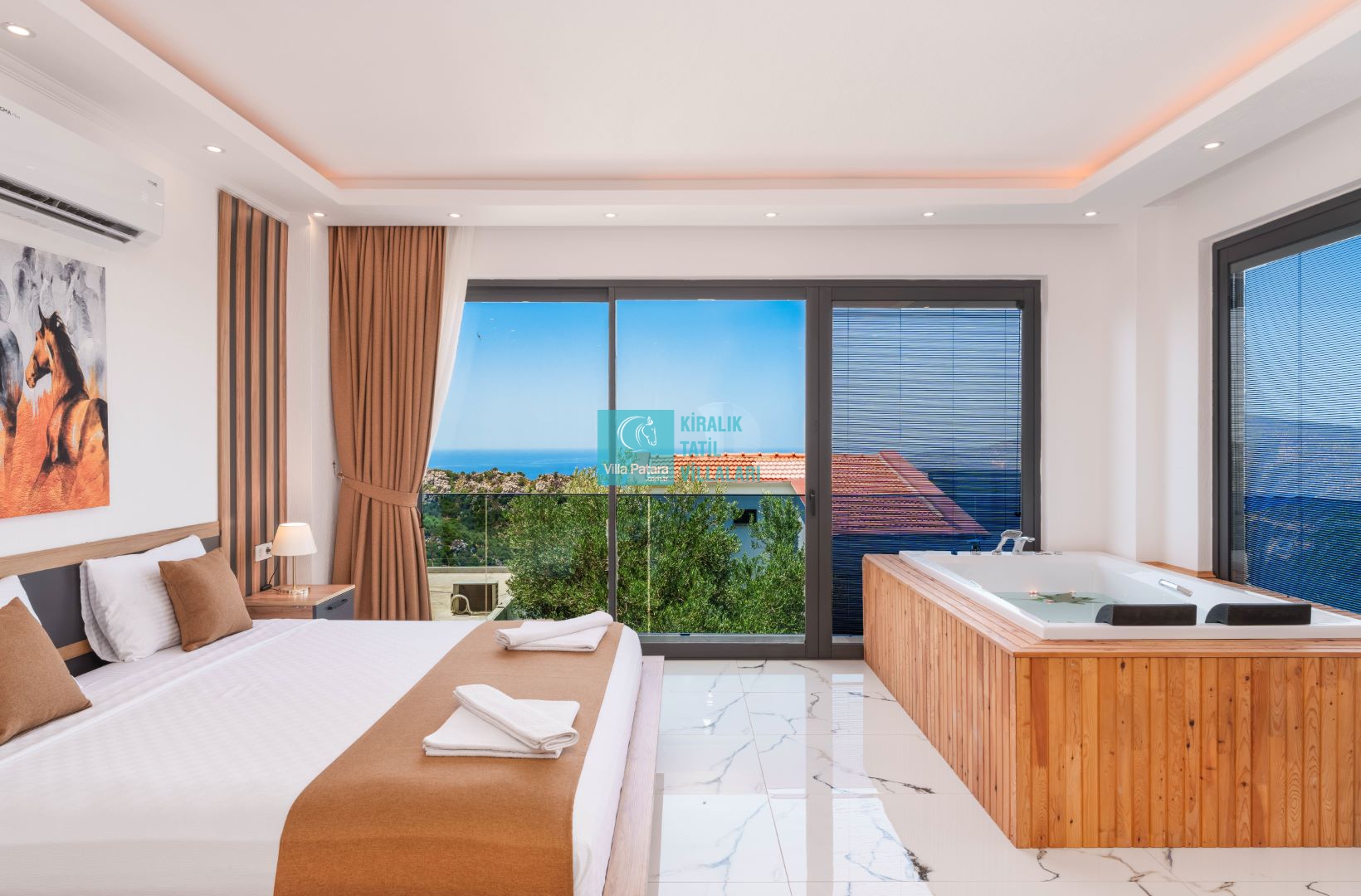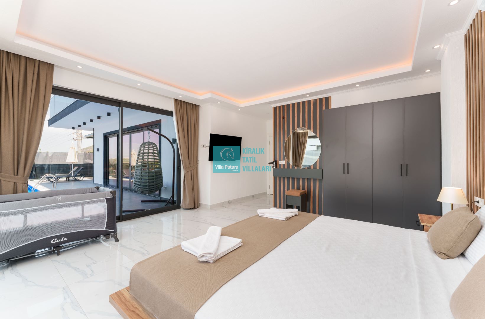 Villamızın içerisinde beş yatak odası ve yedi banyosu bulunmaktadır. Birinci yatak odası içerisinde bir adet çift yatak, banyo; İkinci yatak odası içerisinde bir adet çift kişilik yatak, banyo, jakuzi, klima ve tv; Üçüncü yatak odası içerisinde bir adet çift kişilik yatak, banyo, jakuzi, klima ve tv; Dördüncü yatak odası içerisinde bir adet çift kişilik yatak, banyo ve klima; Beşinci yatak odası içerisinde iki adet tek kişilik yatak, banyo, ve klima bulunmaktadır. Villamızın içerisinde iki adet salon bulunmaktadır. Salon içerisinde mutfak, klima, iki adet banyo, sauna, hamam mevcuttur.