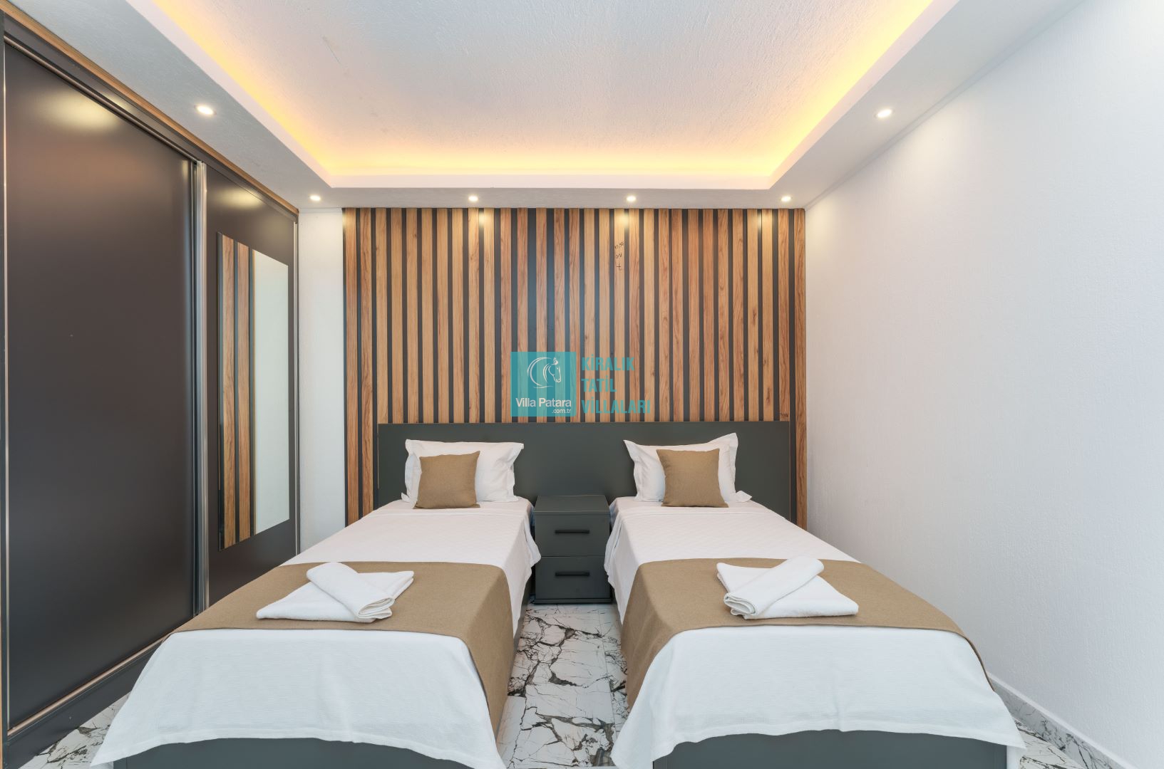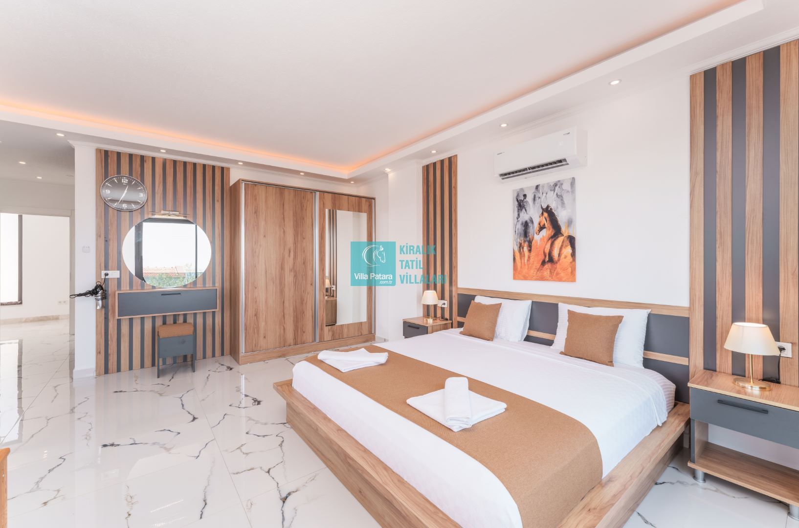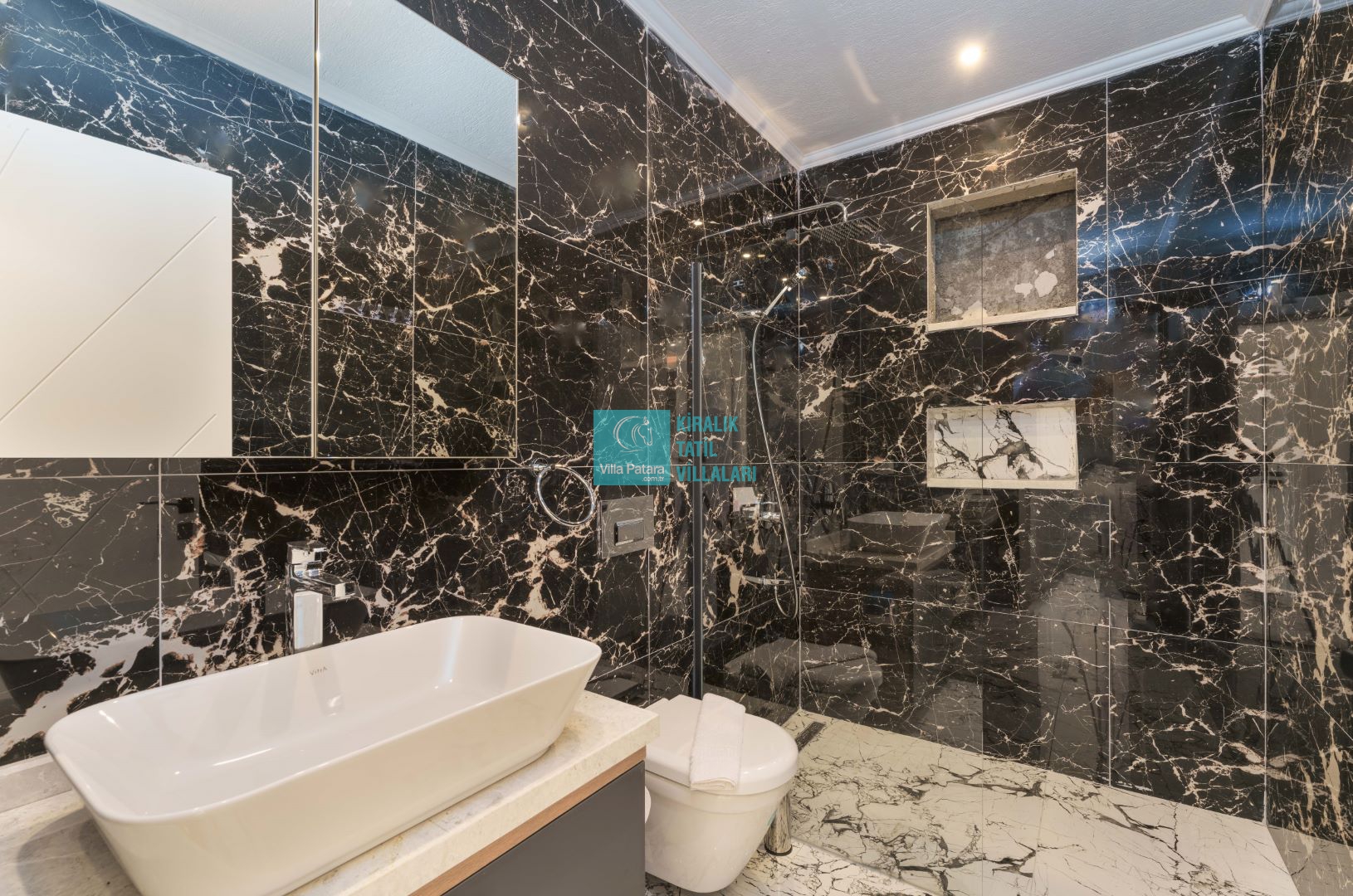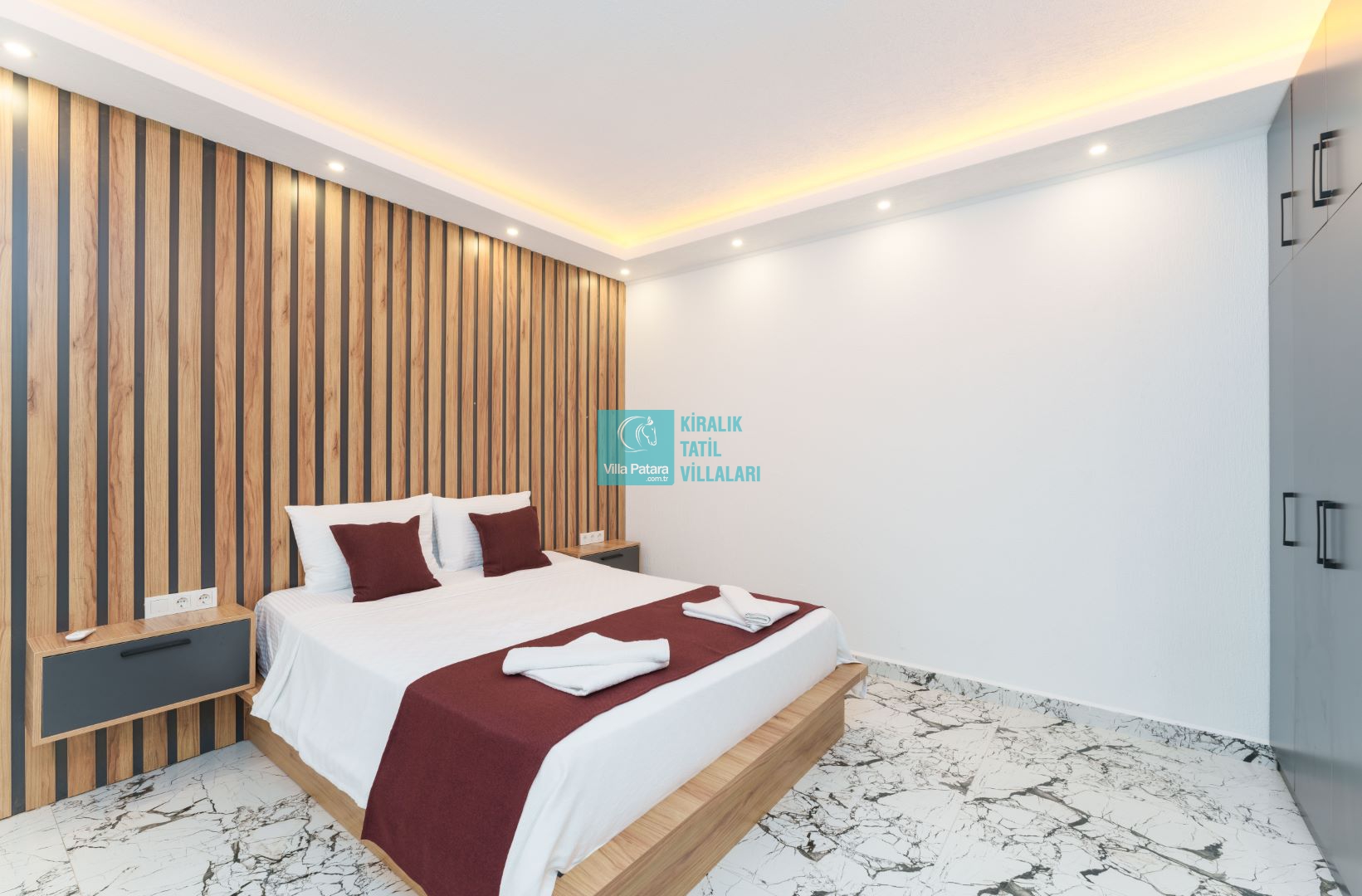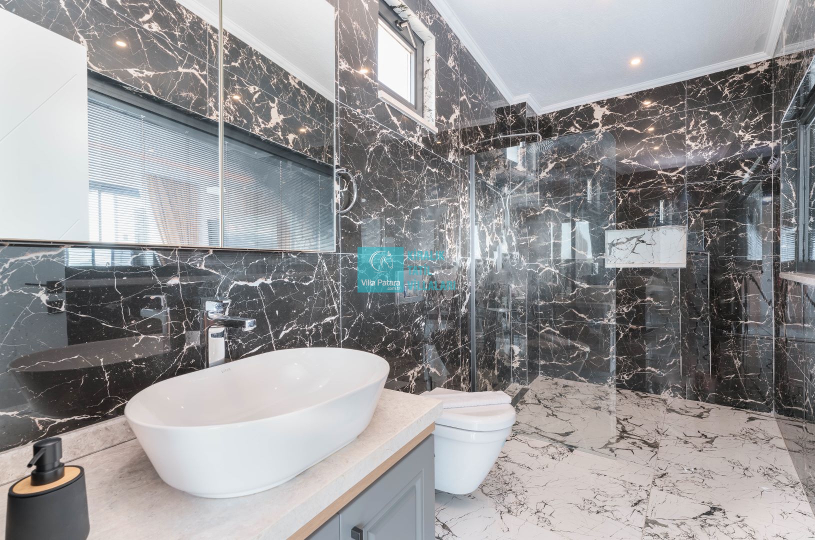 Villamızın içerisinde beş yatak odası ve yedi banyosu bulunmaktadır. Birinci yatak odası içerisinde bir adet çift yatak, banyo; İkinci yatak odası içerisinde bir adet çift kişilik yatak, banyo, jakuzi, klima ve tv; Üçüncü yatak odası içerisinde bir adet çift kişilik yatak, banyo, jakuzi, klima ve tv; Dördüncü yatak odası içerisinde bir adet çift kişilik yatak, banyo ve klima; Beşinci yatak odası içerisinde iki adet tek kişilik yatak, banyo, ve klima bulunmaktadır. Villamızın içerisinde iki adet salon bulunmaktadır. Salon içerisinde mutfak, klima, iki adet banyo, sauna, hamam mevcuttur.