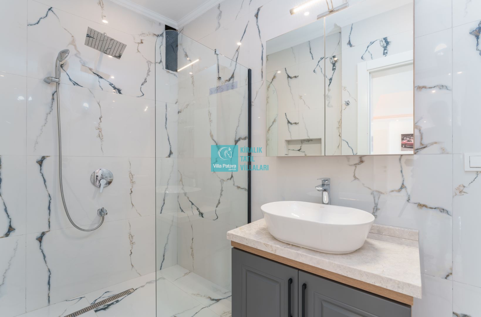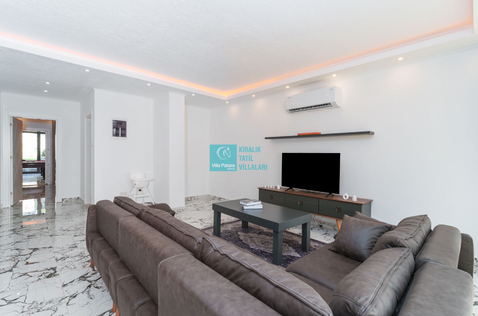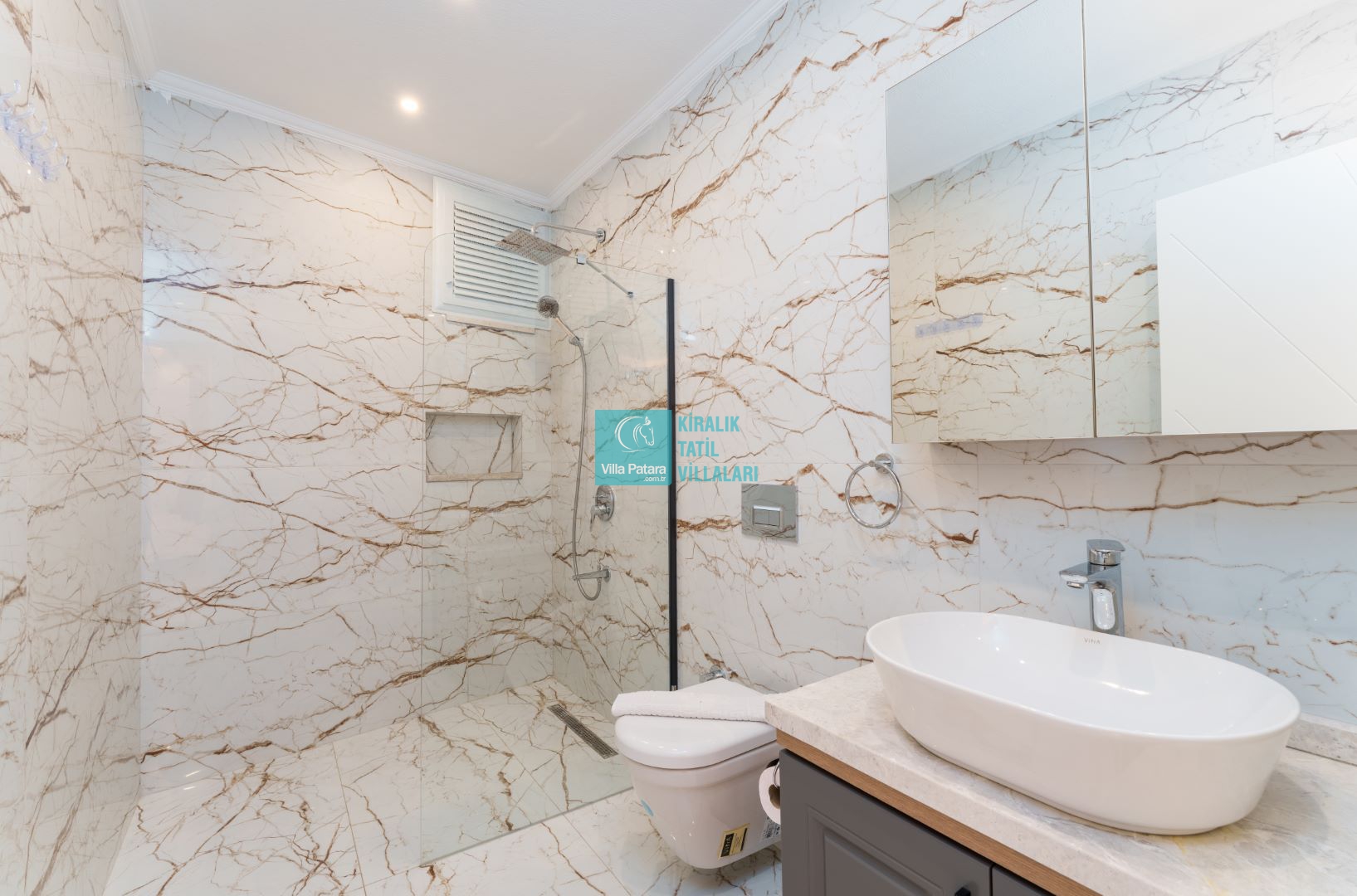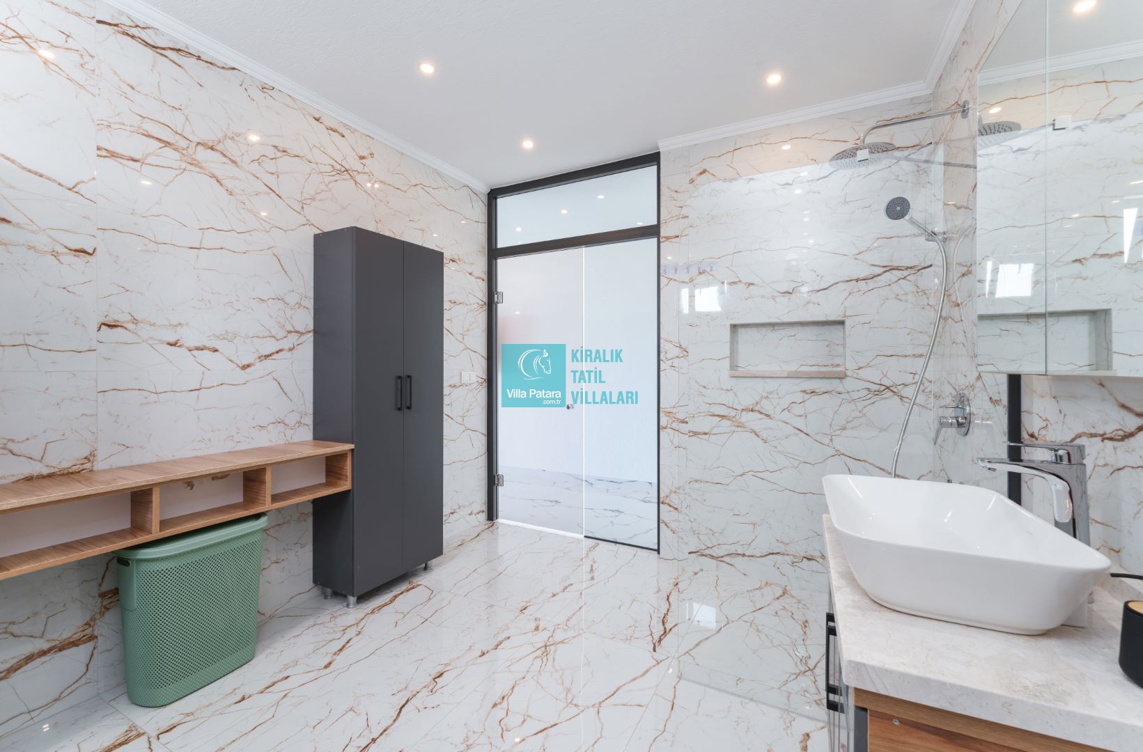Villamızın içerisinde beş yatak odası ve yedi banyosu bulunmaktadır. Birinci yatak odası içerisinde bir adet çift yatak, banyo; İkinci yatak odası içerisinde bir adet çift kişilik yatak, banyo, jakuzi, klima ve tv; Üçüncü yatak odası içerisinde bir adet çift kişilik yatak, banyo, jakuzi, klima ve tv; Dördüncü yatak odası içerisinde bir adet çift kişilik yatak, banyo ve klima; Beşinci yatak odası içerisinde iki adet tek kişilik yatak, banyo, ve klima bulunmaktadır. Villamızın içerisinde iki adet salon bulunmaktadır. Salon içerisinde mutfak, klima, iki adet banyo, sauna, hamam mevcuttur.