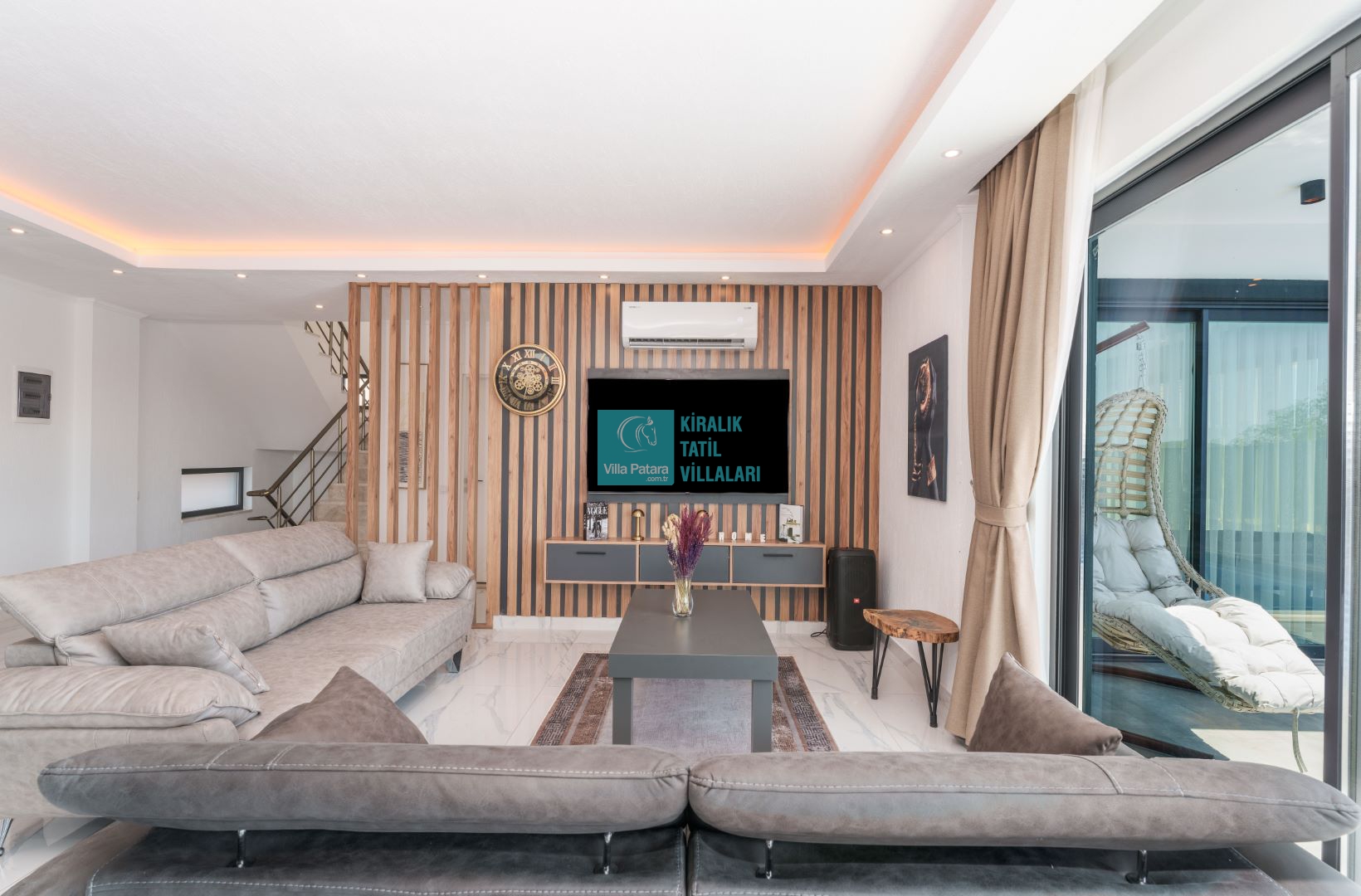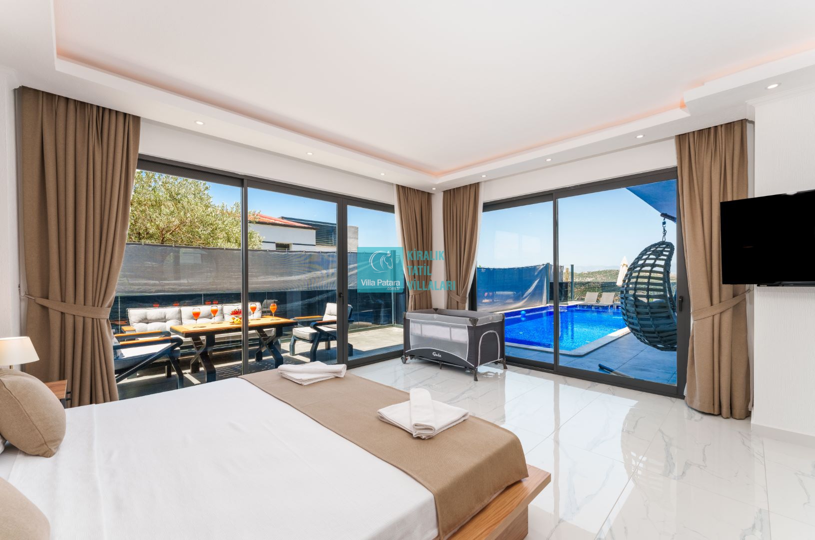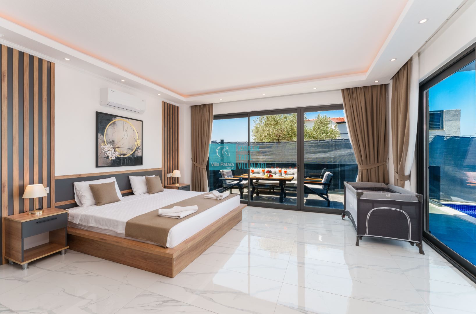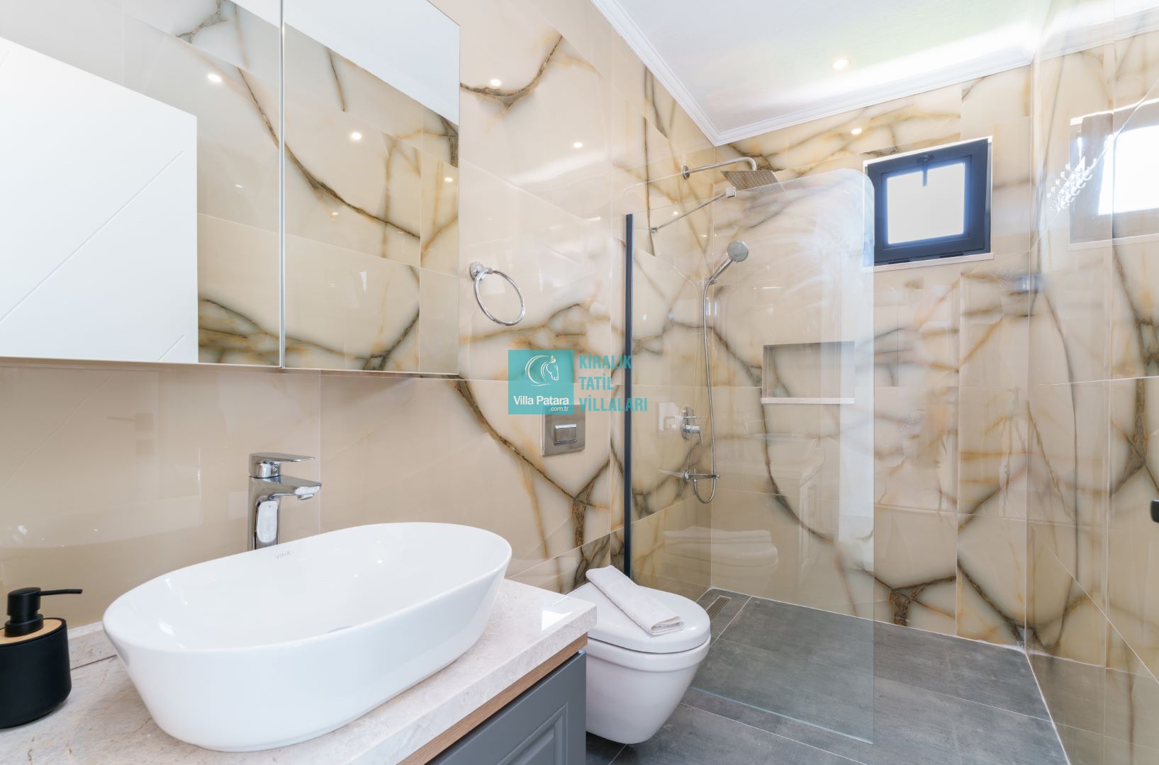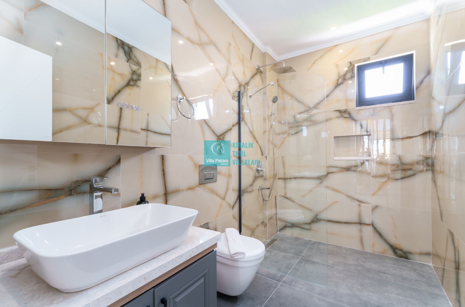 Villamızın içerisinde beş yatak odası ve yedi banyosu bulunmaktadır. Birinci yatak odası içerisinde bir adet çift yatak, banyo; İkinci yatak odası içerisinde bir adet çift kişilik yatak, banyo, jakuzi, klima ve tv; Üçüncü yatak odası içerisinde bir adet çift kişilik yatak, banyo, jakuzi, klima ve tv; Dördüncü yatak odası içerisinde bir adet çift kişilik yatak, banyo ve klima; Beşinci yatak odası içerisinde iki adet tek kişilik yatak, banyo, ve klima bulunmaktadır. Villamızın içerisinde iki adet salon bulunmaktadır. Salon içerisinde mutfak, klima, iki adet banyo, sauna, hamam mevcuttur.