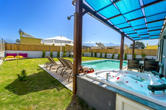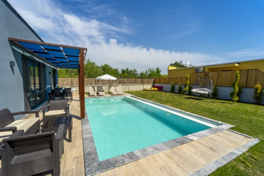 Havuz : Villamıza özel 4 X 8 metre ebatlarında ve1.50 cm derinliğinde olmak üzere yüzme havuzu bulunmaktadır. Çocuk havuzu 2 metreye 2 2 metre 0,50 cm derinlik Havuz ve bahçe bakımı günde 1 kez sabah veya akşam yapılmaktadır. Havuz kenarında ise şezlong, bahçe oturma grubu, yemek masası, salıncak ve çocuk parkı bulunmaktadır.