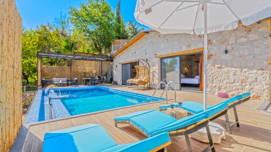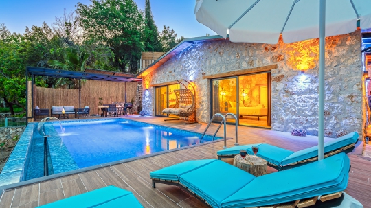 Kalkan İslamlar Mevkiinde bulunan kiralık villa, sessiz sakin bir konumda sevdikerinizle huzurlu bir tatil isteyen ailelerimiz için oldukça uygun bir seçenektir. Muhafazakar villalar ve jakuzili villalar kategorisinde yer alan villamız, 1 yatak odası ile 2 kişilik konaklama kapasitesine sahiptir. Havuzu korunaklı ve bahçesi dışarıdan görünmeyen Villa White Rock Duo, mahremiyete önem veren aileleriniz ve arkadaş grupları için huzur dolu bir tatil fırsatı sunuyor. Ayrıca villamızda, tüm yılın vermiş olduğu yorgunluğu atabileceğiniz jakuzi konforu da sağlanmaktadır.