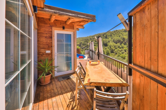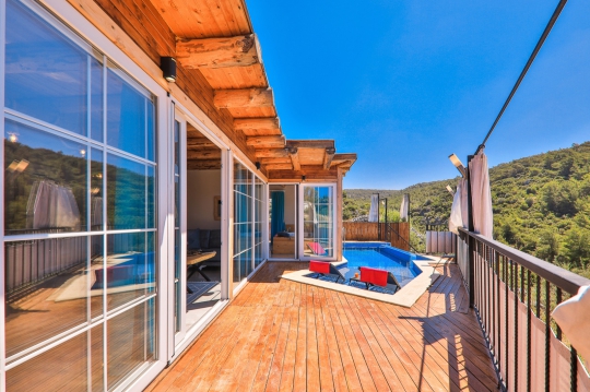 Terasında özel yüzme havuzu, şezlonglar, masa ve sandalyeler, mangal bulunmaktadır.