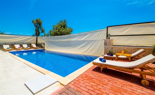 Kiralık villa deniz manzaralıdır. Havuz terası korunaklı olan kiralık yazlık içerisinde birden fazla balkon bulunur. Ayrı bir terası da bulunan yazlık villa içerisinde açık havuz vardır. Havuzun genişliği 4 metre, uzunluğu 8 metre, derinliği ise 1,55 cm'dir.
