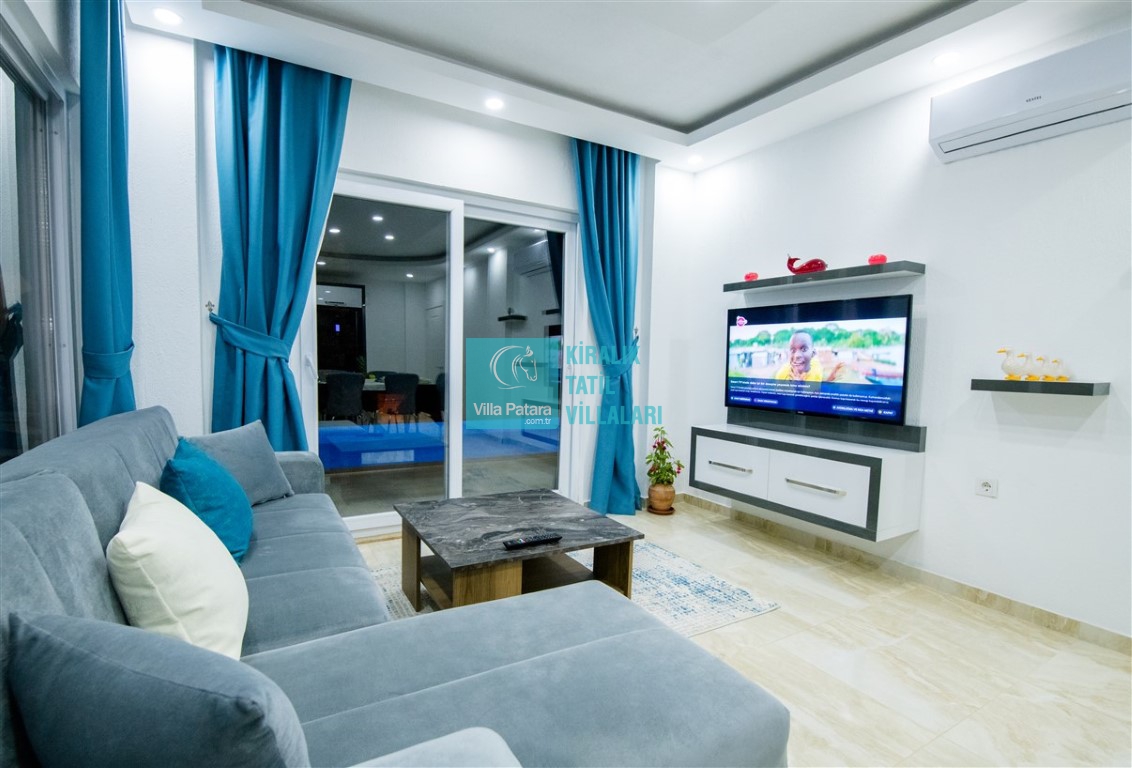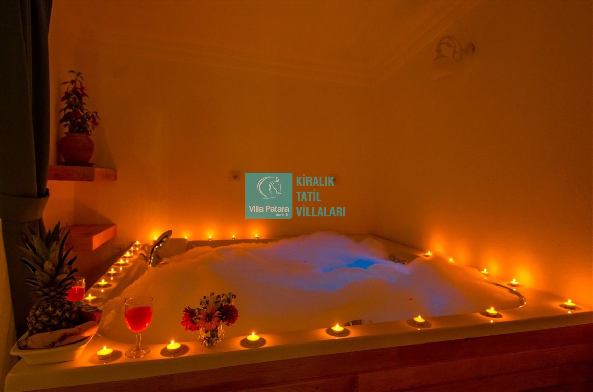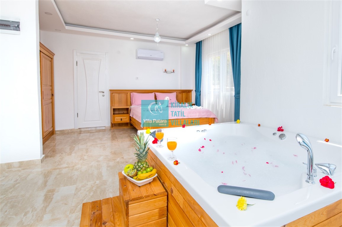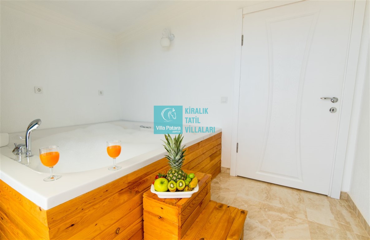 Antalya'nın Kalkan bölgesinde bulunan tripleks villa üç katlı olması sayesinde farklı çiftlerin aynı anda konaklamasına izin verir. Kiralık villa içerisinde 4 farklı yatak odası vardır. İlk yatak odasında çift kişilik yatak, klima, jakuzi, banyo ve tuvalet; ikinci yatak odasında çift kişilik yatak, klima, jakuzi, banyo ve tuvalet, üçüncü yatak odasında iki adet tek kişilik yatak, klima, banyo ve tuvalet, dördüncü yatak odasında bir adet çekyat, klima, banyo ve tuvalet bulunur.