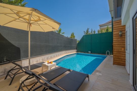 Havuz alanı çimçit perdeleme sistemi ile korunaklı hale getirilmiş olan villamız muhafazakar aileler için de uygundur.